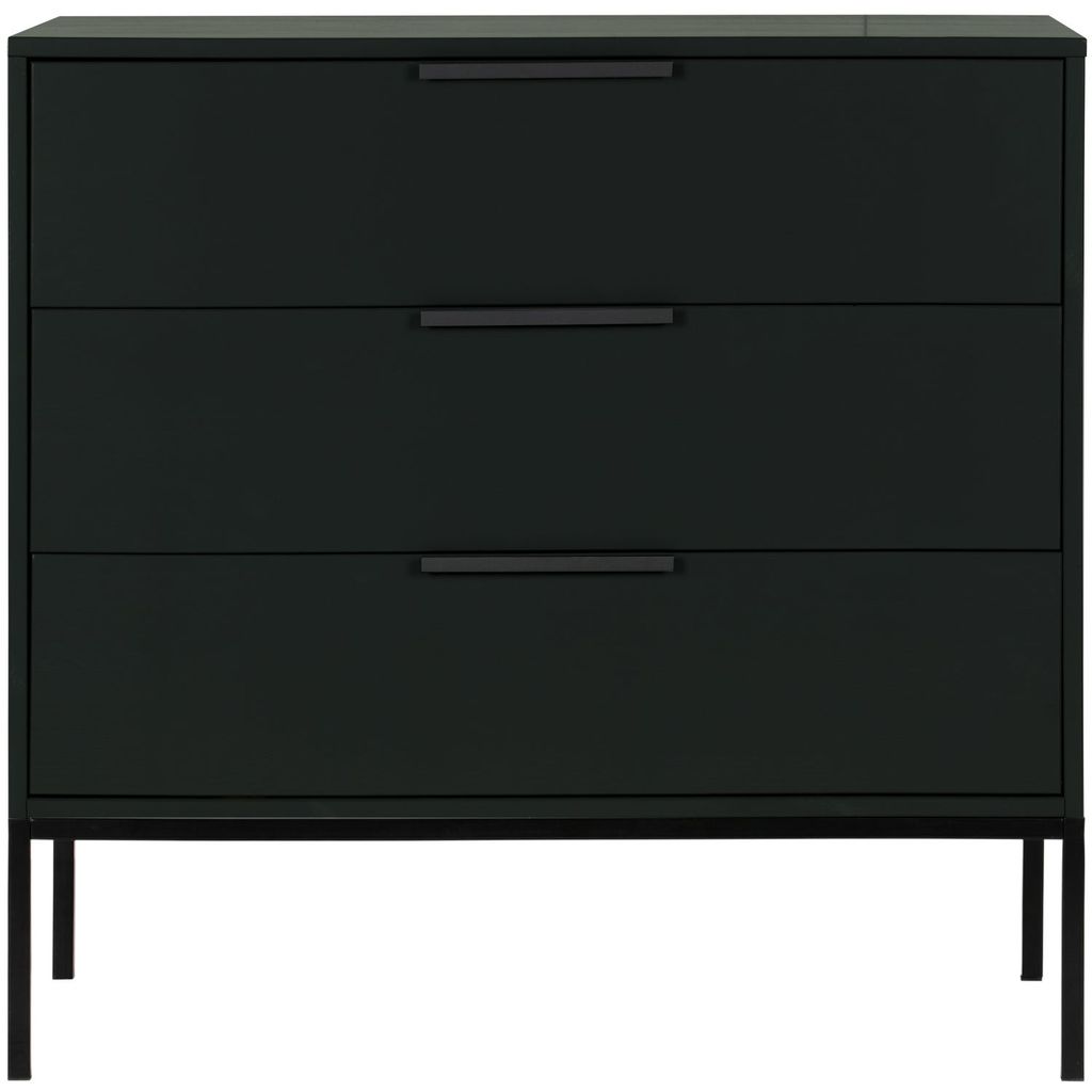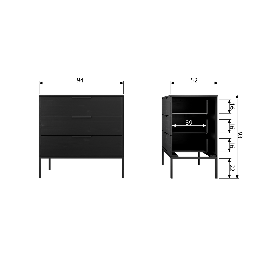 Byrån mäter H 93 cm x B 94 cm x D 52 cm, vilket gör den till en idealisk förvaringslösning för både stora och små utrymmen. De tre rymliga lådorna har en bärkapacitet på 15 kg vardera, vilket ger gott om plats för alla dina behov. Det mattsvarta underredet och handtagen ger en elegant kontrast till den borstade ytan.