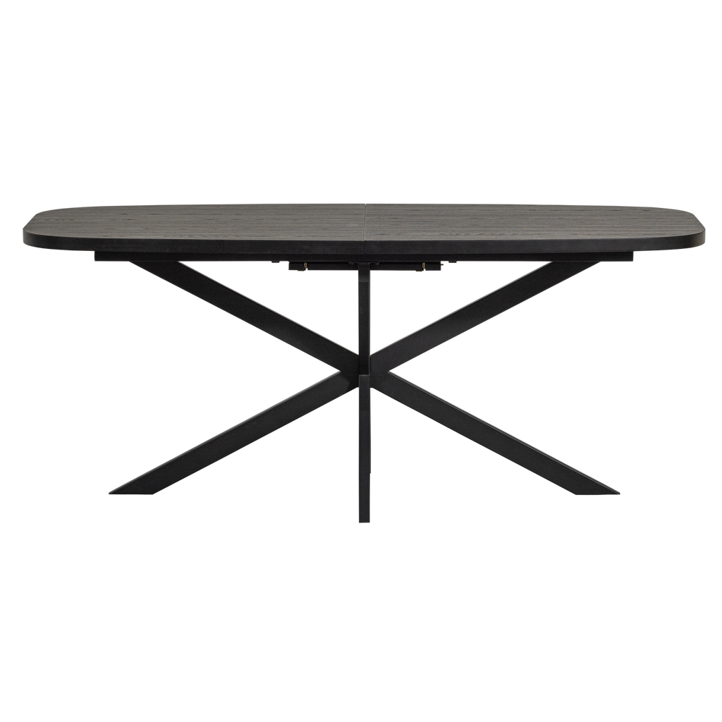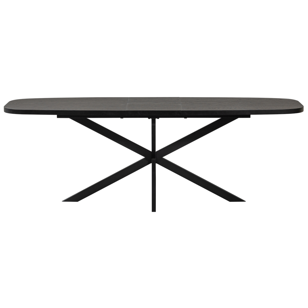 WOOOD Arros utdragbart matbord är det ideala valet för dig som söker både stil och funktionalitet i ditt hem. Tillverkat av högkvalitativ svart MDF, utstrålar detta bord en modern och elegant känsla som enkelt kan integreras i olika inredningsstilar. Bordets ovala form ger en mjuk visuell effekt, medan den stabila kryssfoten inte bara bidrar till ett stilrent utseende utan också maximerar benutrymmet för komfort.