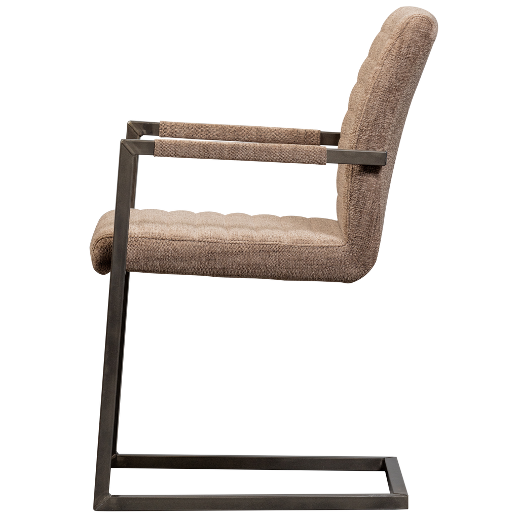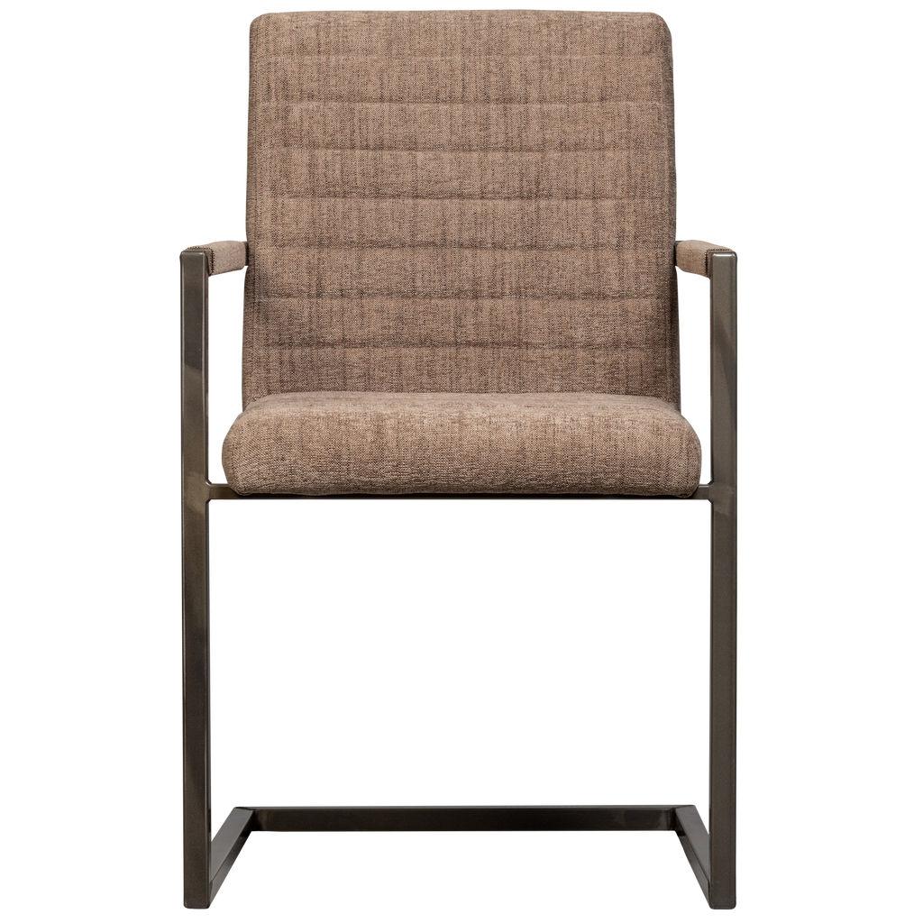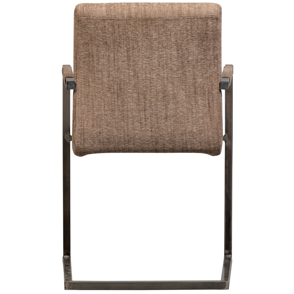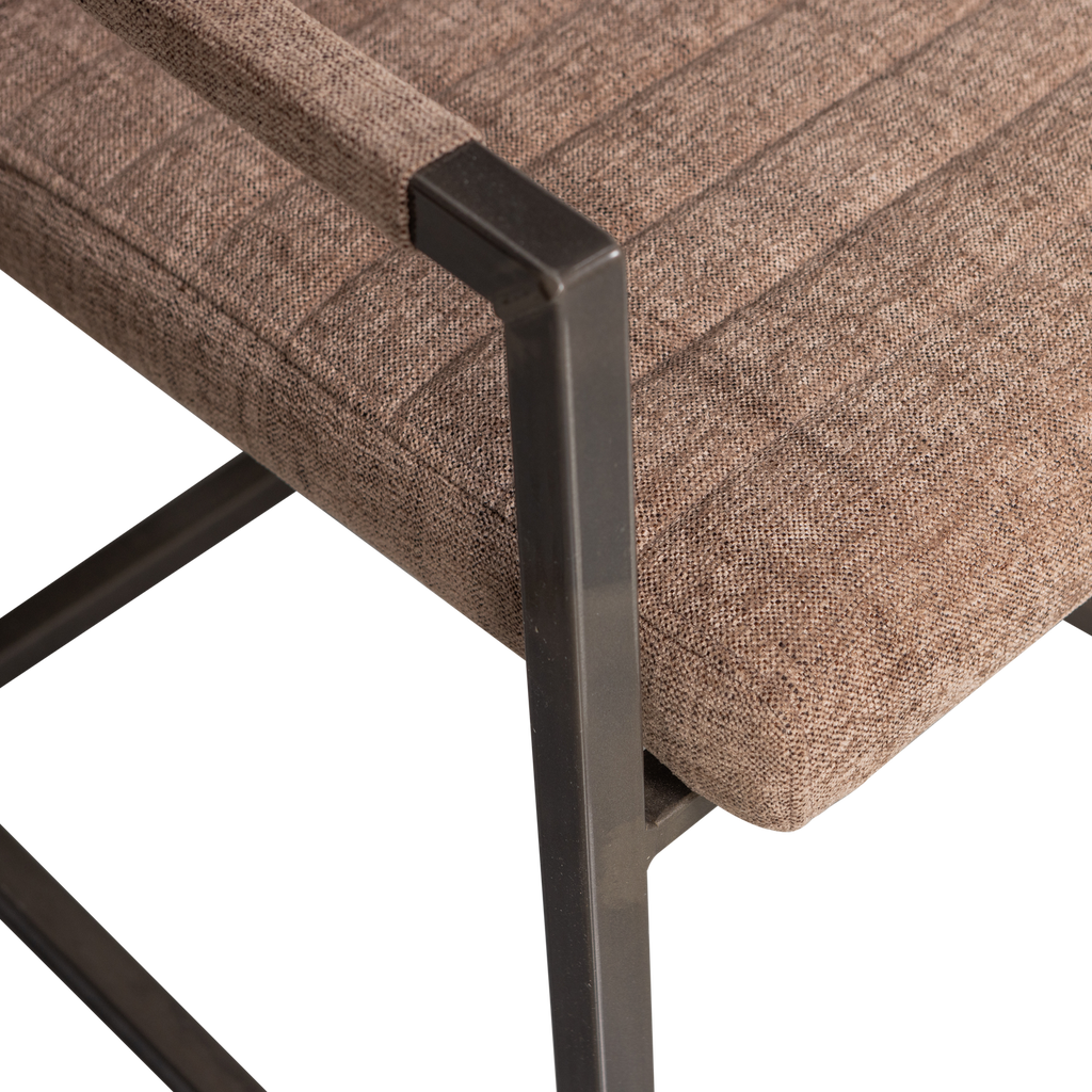 Denna stol är klädd i ett vävt tyg i brun melange som ger en varm och inbjudande atmosfär. Den robusta metallramen har en modern matt svart pulverlackering som kompletterar den sofistikerade designen. Sitsens ribbade struktur lägger till en extra touch av elegans.