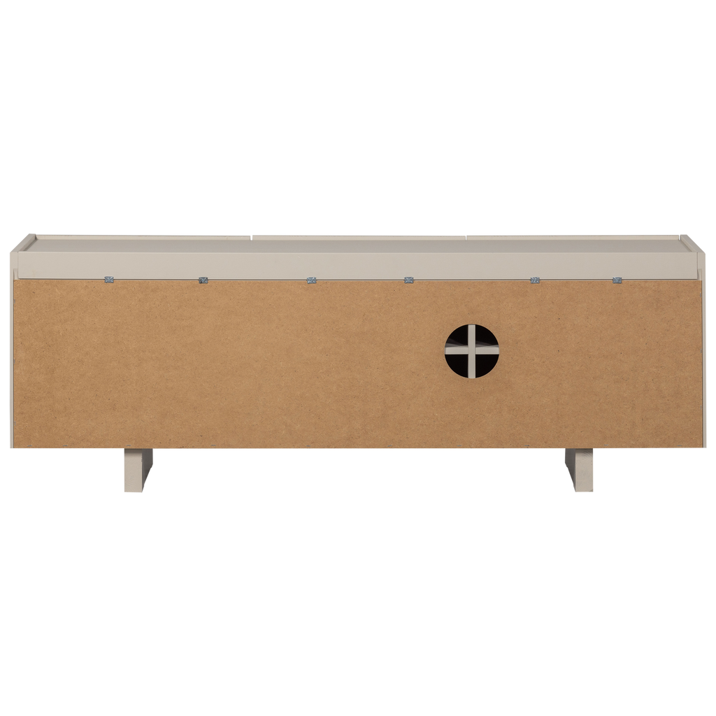 Med mått på H 53 cm x B 152 cm x D 46 cm erbjuder bänken gott om förvaringsutrymme med sina tre skåpdörrar och hyllor. Varje hyllplan har en bärkapacitet på 15 kg, medan bänkens ovansida kan bära upp till 35 kg, vilket gör den idealisk för både mediautrustning och dekorativa föremål.
