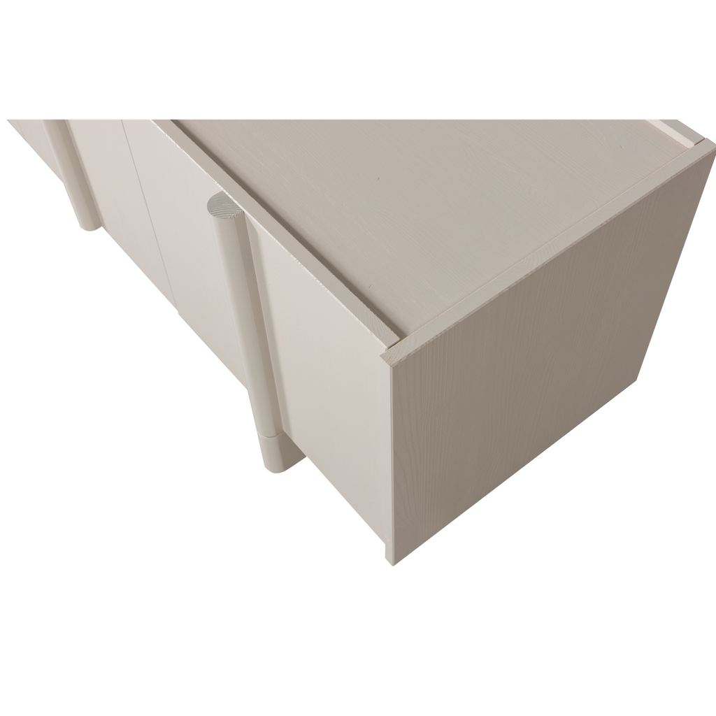 Elegant TV-bänk i FSC-certifierad furu med naturliga ådringar. Optimal förvaring med tre skåp och hyllor.