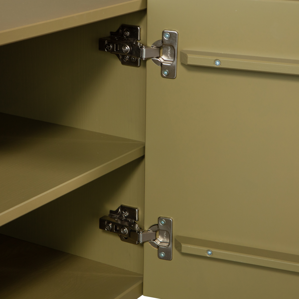 Elegant TV-bänk i mossgrön furu med modern skandinavisk design. Perfekt för stilmedvetna hem.