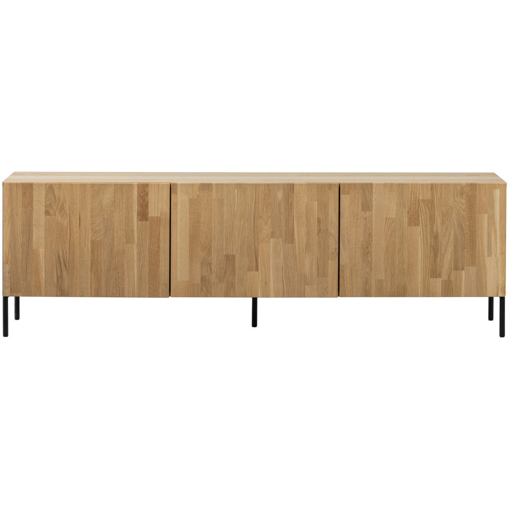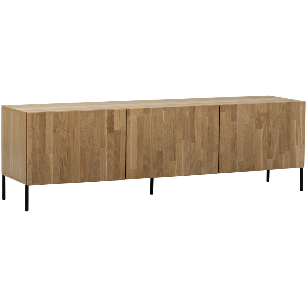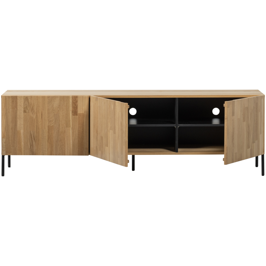 Tillverkat av högkvalitativt ek, har möbeln en vacker naturlig finish som förhöjer varje rum. Den ljusbruna ton med mjuk gul nyans och synlig ådring ger varje möbel en unik karaktär. De tre skåpdörrarna har en smart integrerad greppdesign som döljer ett rymligt förvaringsutrymme, idealiskt för att hålla ordning på media och andra viktiga saker.