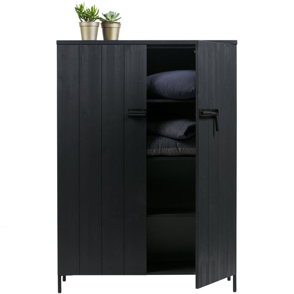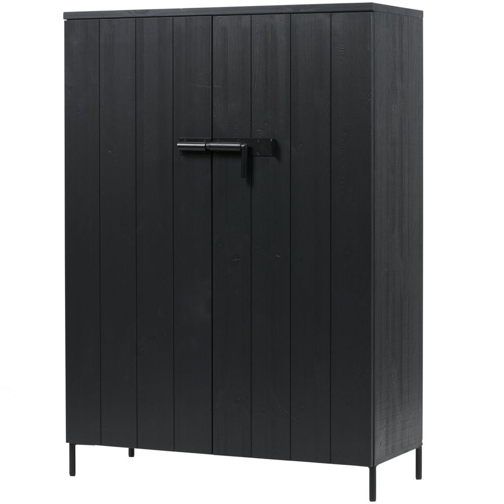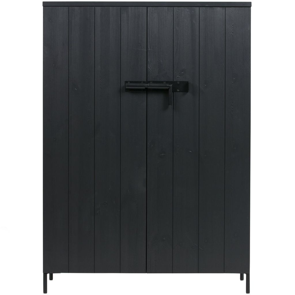 Upptäck det stilrena WOOOD BRUUT 2-dörrars skåpet, en perfekt blandning av robust design och funktionalitet. Tillverkat av högkvalitativ borstad furu och färdigbehandlat i en djup svart färg, kommer detta skåp att ge varje rum ett stilrent utseende. Skåpet står på starka metallben, vilket ger det en industriell känsla, samtidigt som de matchande metallbeslagen ger ett extra lager av elegans. Med en höjd på 140,5 cm, bredd på 100 cm och ett djup på 41,5 cm, erbjuder det gott om förvaringsutrymme.