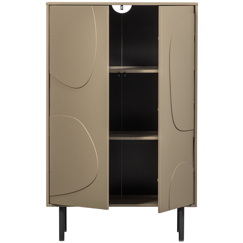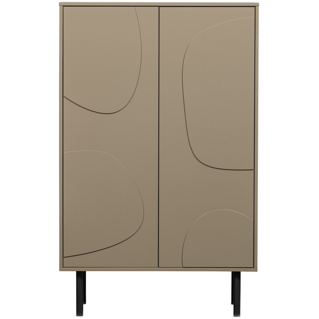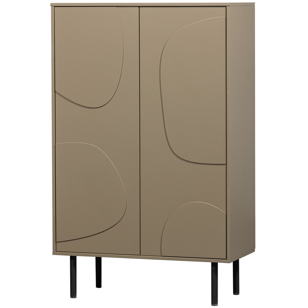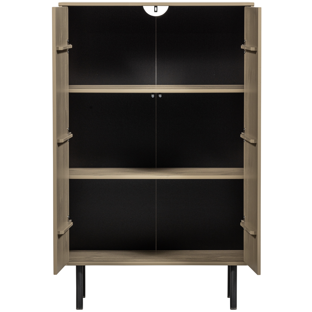 WOOOD CADIZ är ett elegant förvaringsskåp tillverkat av FSC-certifierat furu. Med sin moderna bruna finish och unika, lekfulla mönster erbjuder skåpet en stilfull lösning för ditt hem. De svarta benen skapar en slående kontrast, vilket gör det till ett blickfång i vilket rum som helst.
