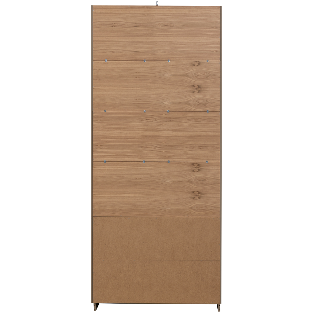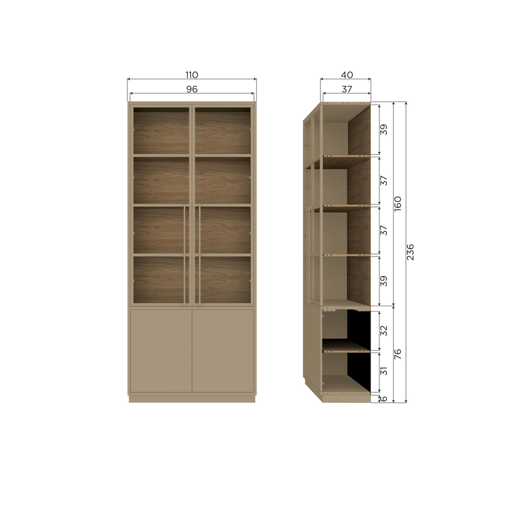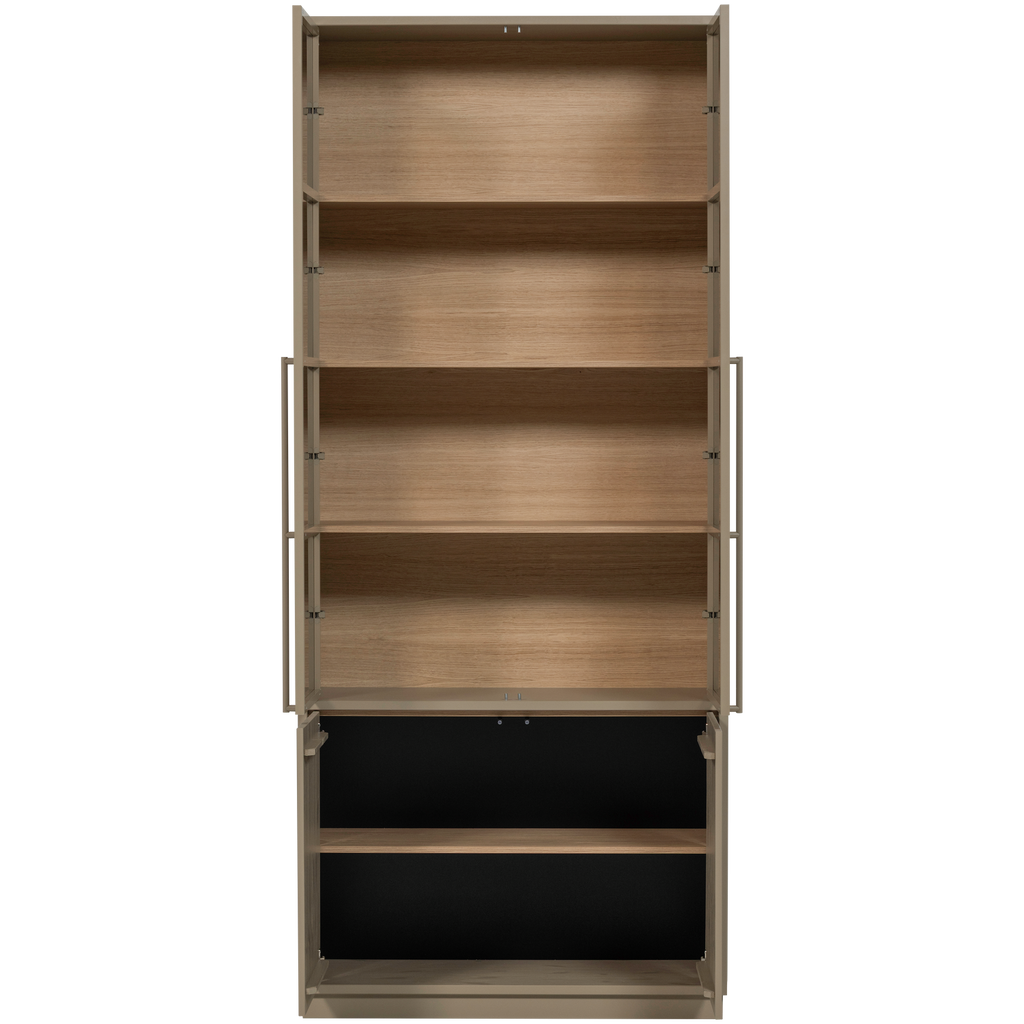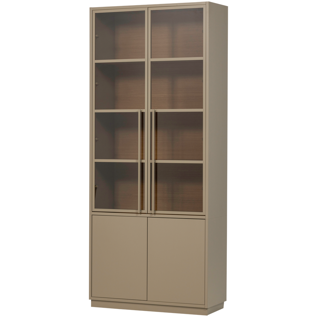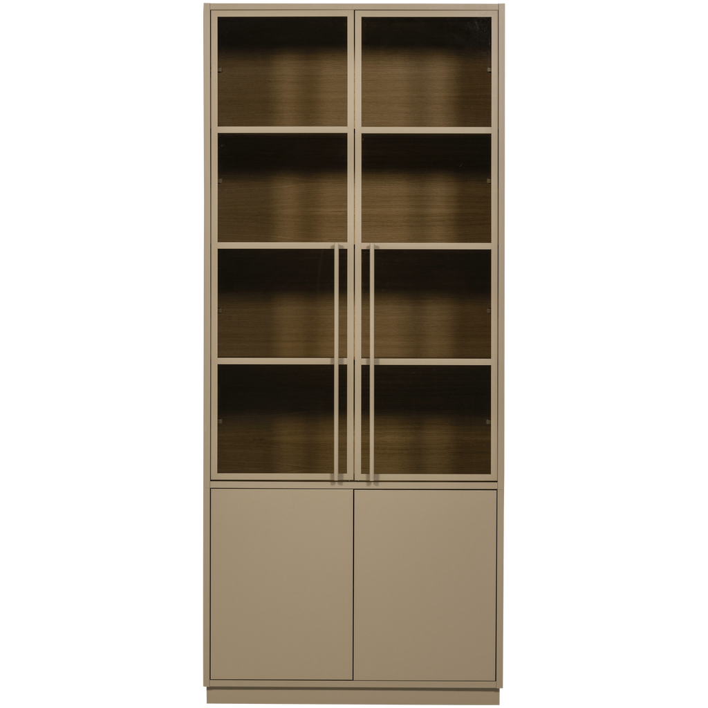 Det övre avsnittet består av fyra rymliga fack, perfekta för att visa upp dina mest älskade föremål bakom glasdörrar, medan det nedre avsnittet ger möjlighet att dölja andra ägodelar bakom diskreta dörrar. Med melamin ekdekor är insidan tålig mot repor och värme, samtidigt som den ger en stilren finish.