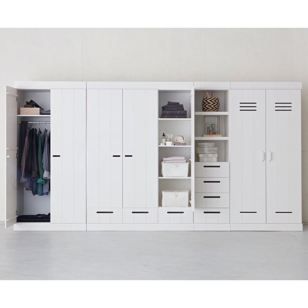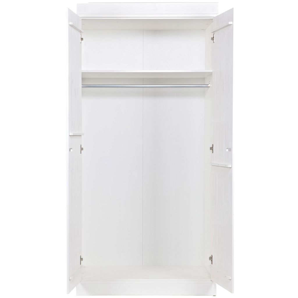 Upptäck WOOOD CONNECT 2-dörrars klädskåp, en perfekt kombination av stil och funktion. Tillverkat av massivt furu med en elegant vit finish, detta klädskåp är både robust och flexibelt.