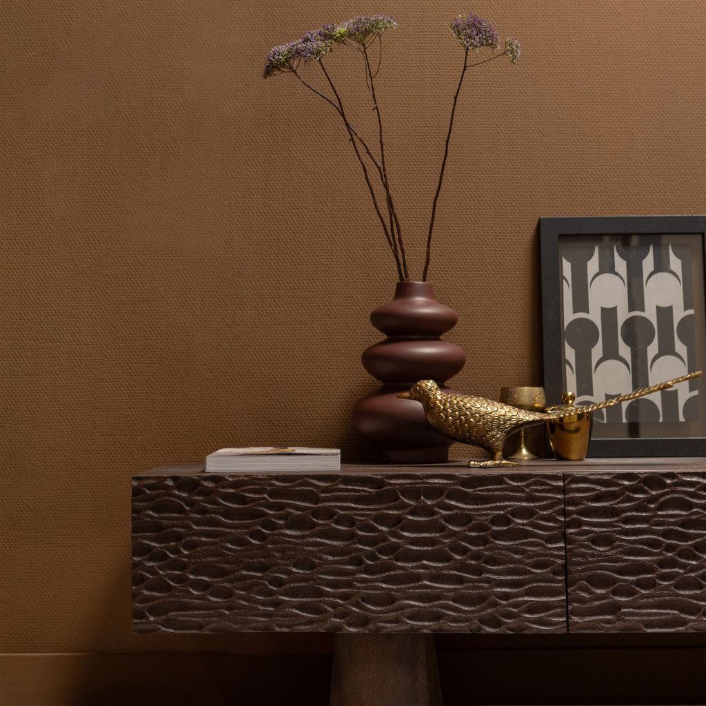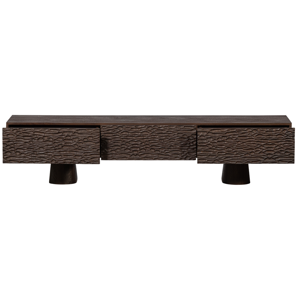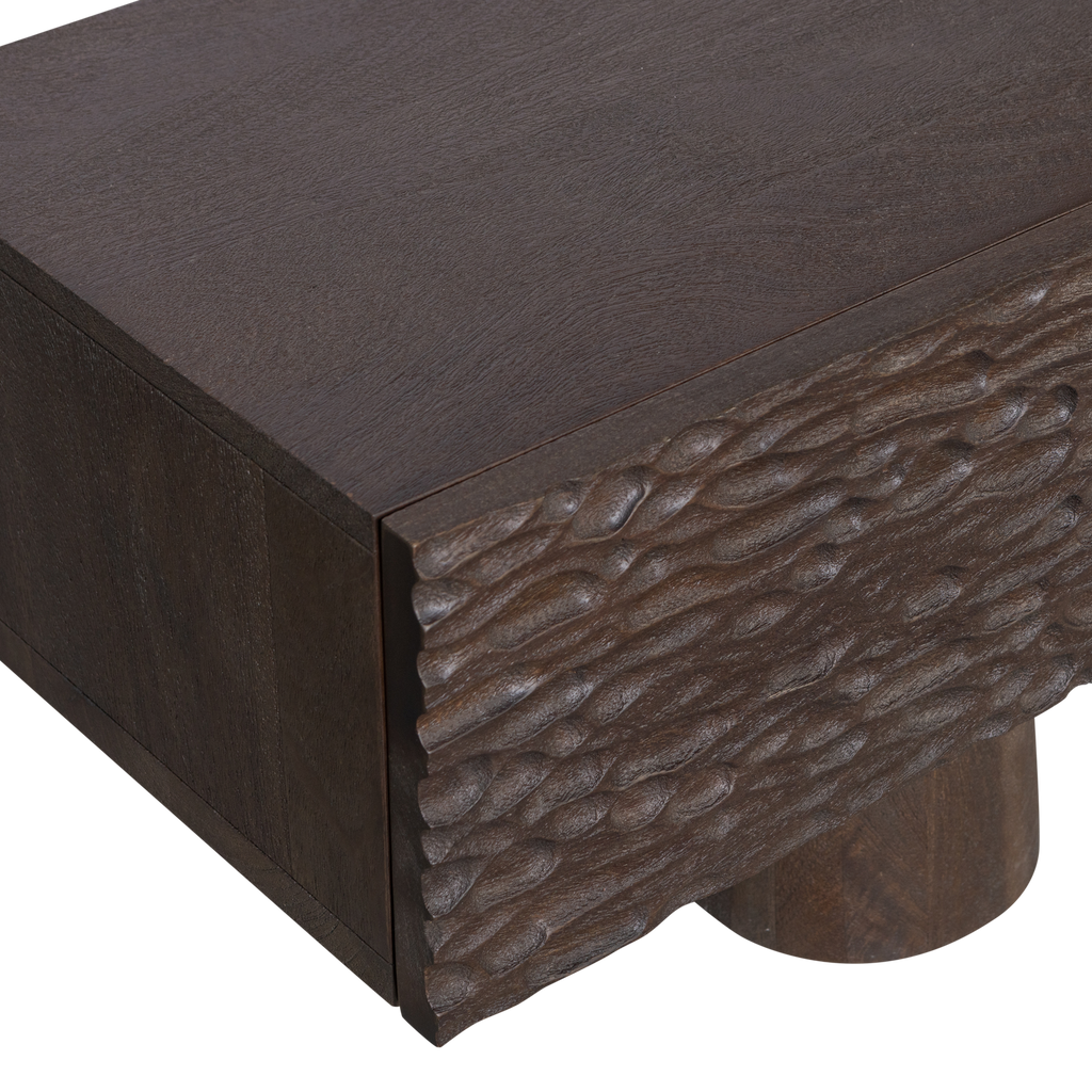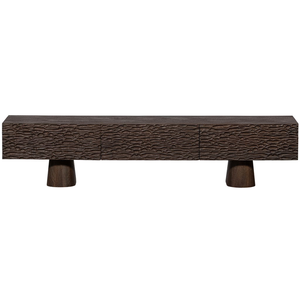 Den WOOOD Crumble Snidad TV-bänken är en elegant kombination av stil och funktionalitet. Tillverkad i högkvalitativt mangoträ, har den en varm och inbjudande mörkbrun valnötsfinish. Dess unika, snidade yta ger en taktil och visuell attraktion, medan de breda benen bidrar till stabiliteten.