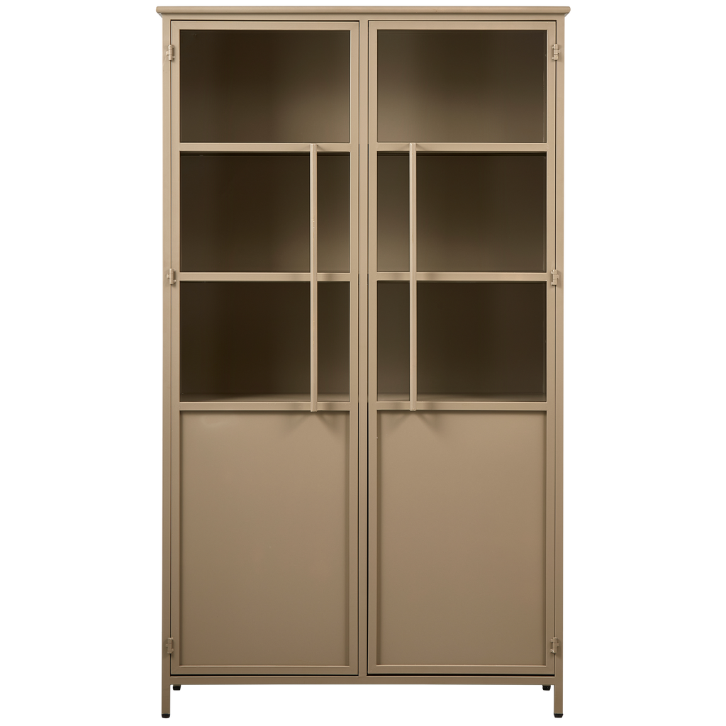 Elegant vitrinskåp i slitstark khakifärgad metall, perfekt för att visa upp dina föremål. Fyra rymliga hyllor.