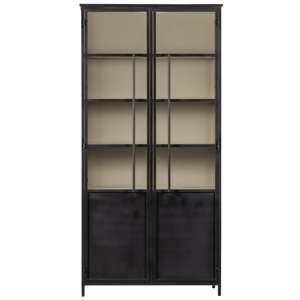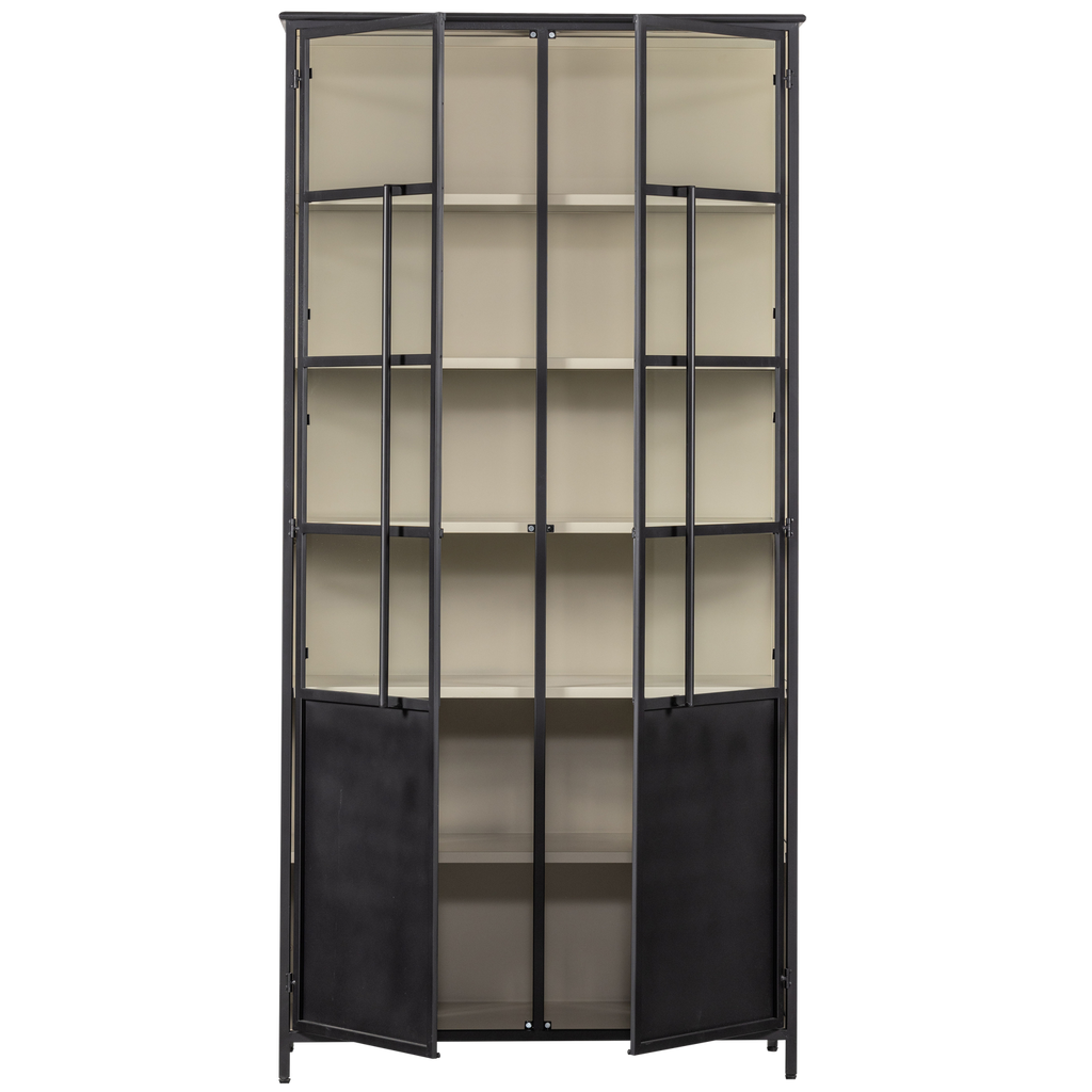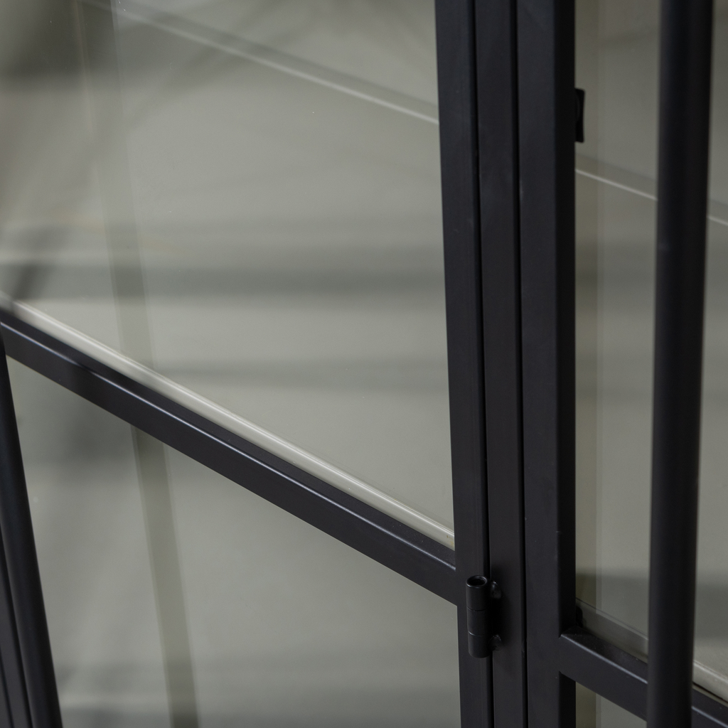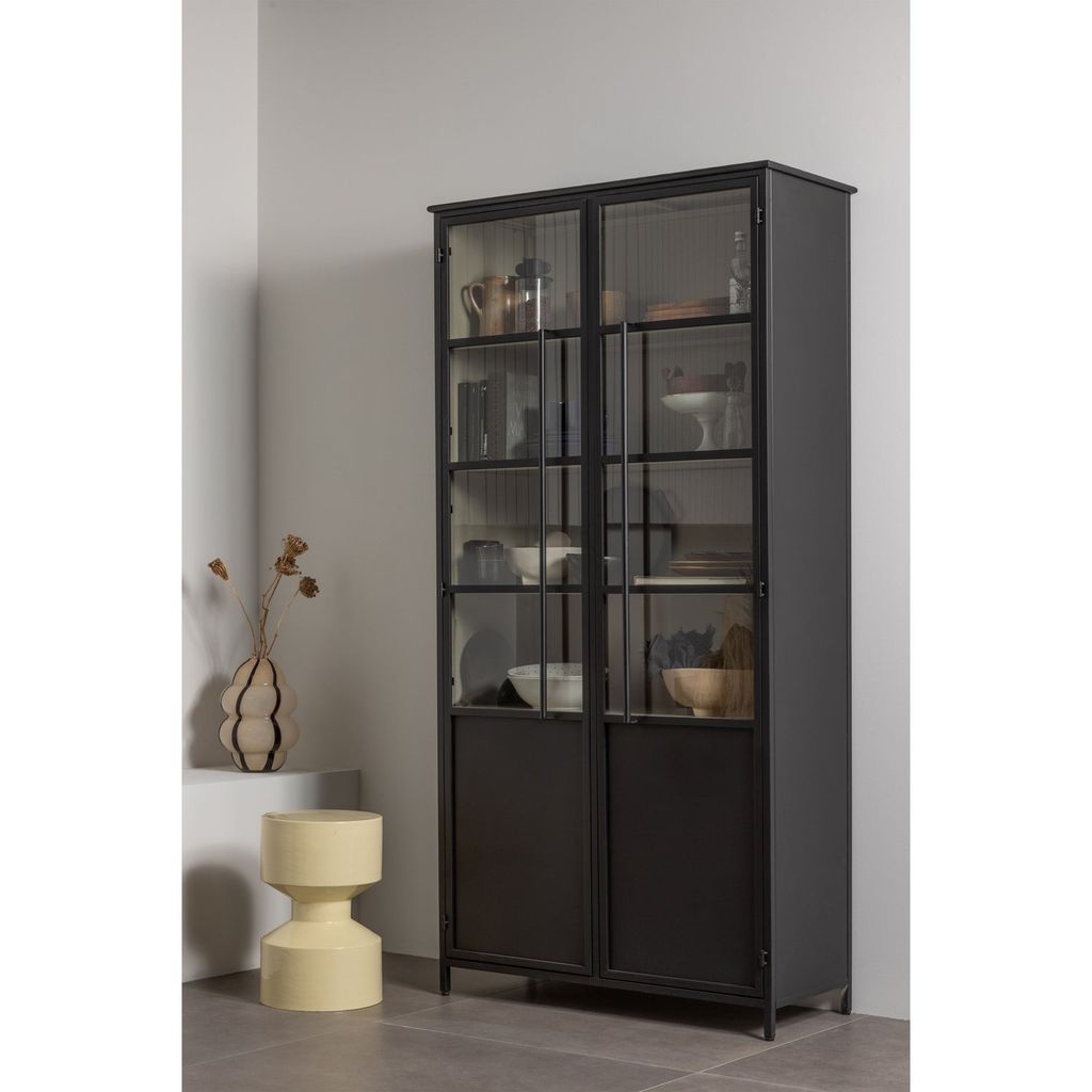 Elegant vitrinskåp i svart pulverlackerat järn med fem hyllplan, perfekt för stilfull förvaring och utställning.