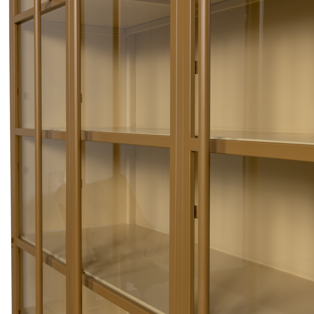 Kraftfull vitrinskåp i matt honungsfärgad finish, tillverkad av pulverlackerat järn med fem hyllplan för snygg presentation.