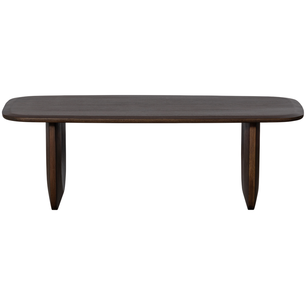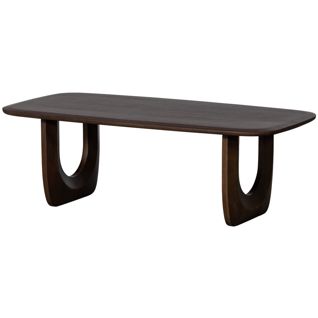 Elegant soffbord i mangoträ med valnötsfärgad finish. Perfekt för retroinspirerade hem med unik design och hållbarhet.