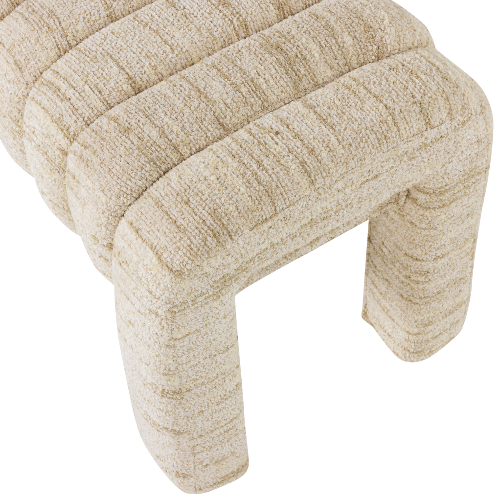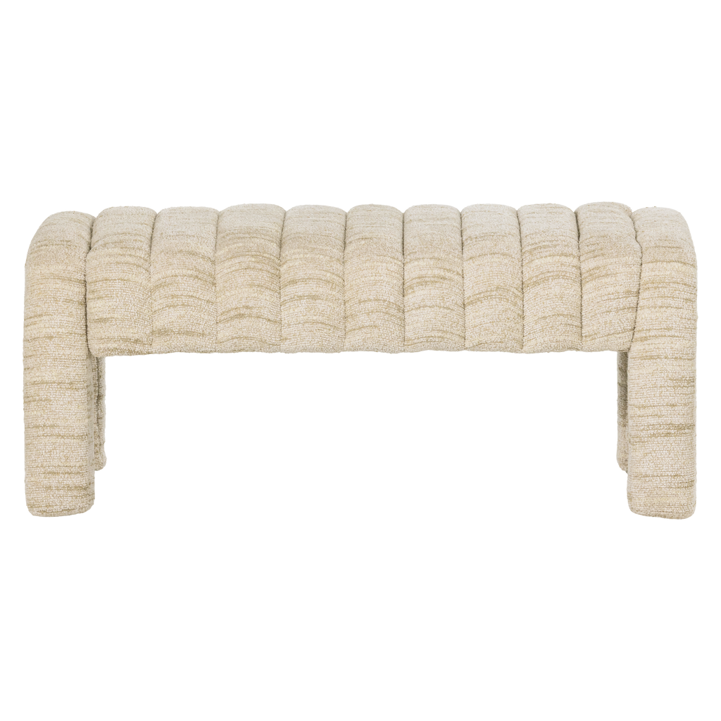 Elegant bänk i mjukt bouclétyg som harmoniserar med modern inredning. Robust och färdigmonterad för direkt användning.
