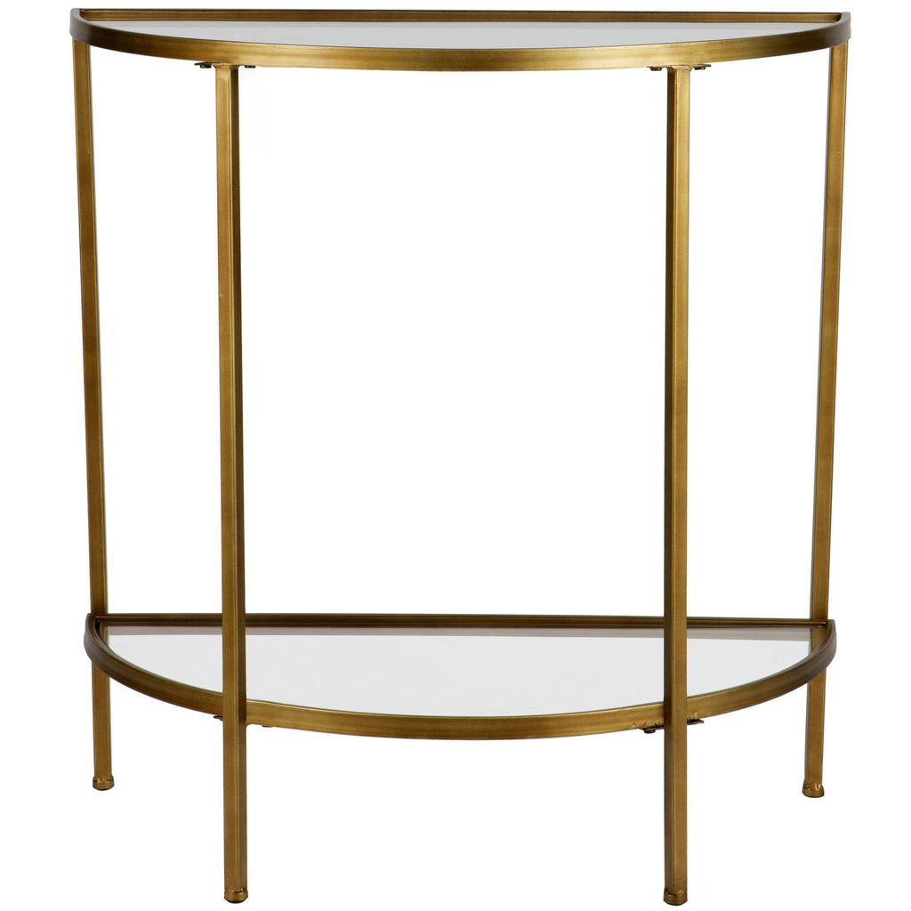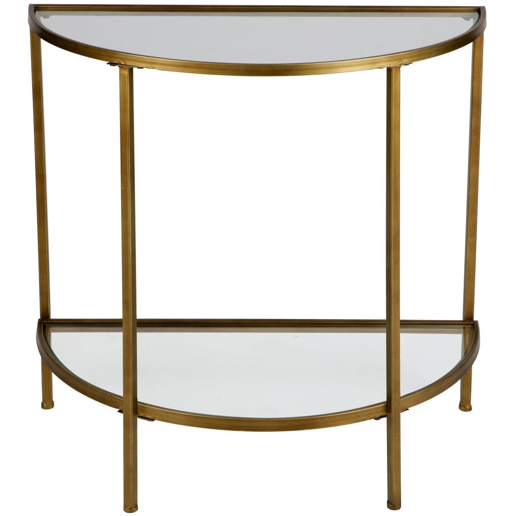 Bordet är konstruerat med en slank järnram som är färdigställd i en tidlös antik mässingsfinish. De två glasade hyllplanen erbjuder både estetisk tilltalande förvaring och en praktisk yta för att visa upp dekorativa föremål. Den vackra kurvningen på framsidan ger ett mjukt och inbjudande intryck, vilket gör att bordet enkelt smälter in i olika inredningsstilar.