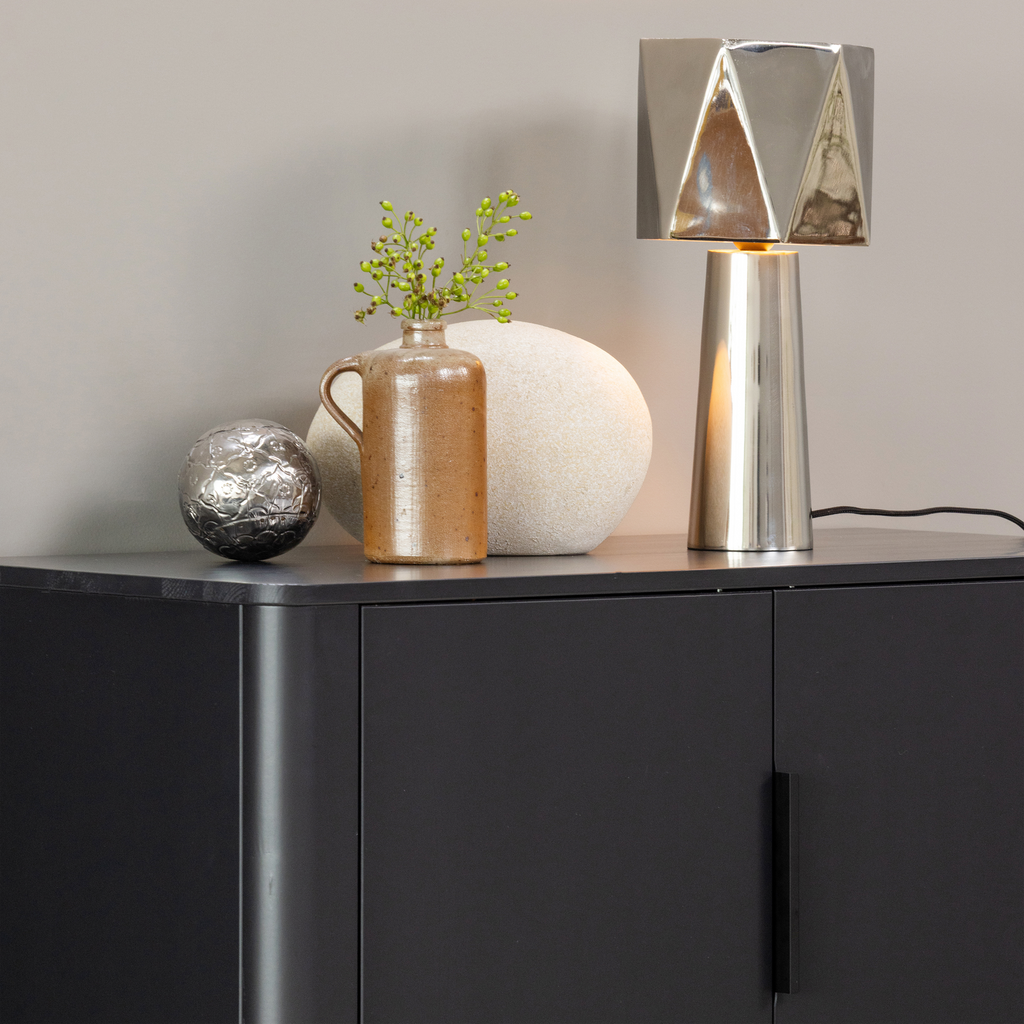 Design och finish: Skåpet har en elegant matt svart yta som lyfter fram träets naturliga ådringar och ger en sofistikerad känsla. De subtila handtagen och de rena linjerna bidrar till dess moderna uttryck.