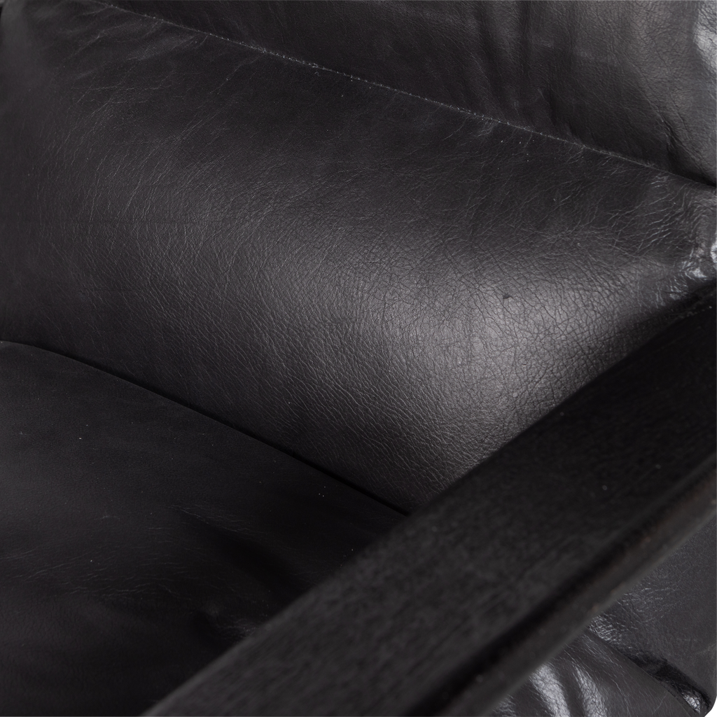 Design och Material: Det svarta lädret accentueras av den robusta träramen, och tillsammans skapar de en elegant och sofistikerad look. Med mått på 86 cm i höjd, 71 cm i bredd och djup, samt ett sittdjup på 46 cm och en sitthöjd på 48 cm, är fåtöljen både rymlig och bekväm.