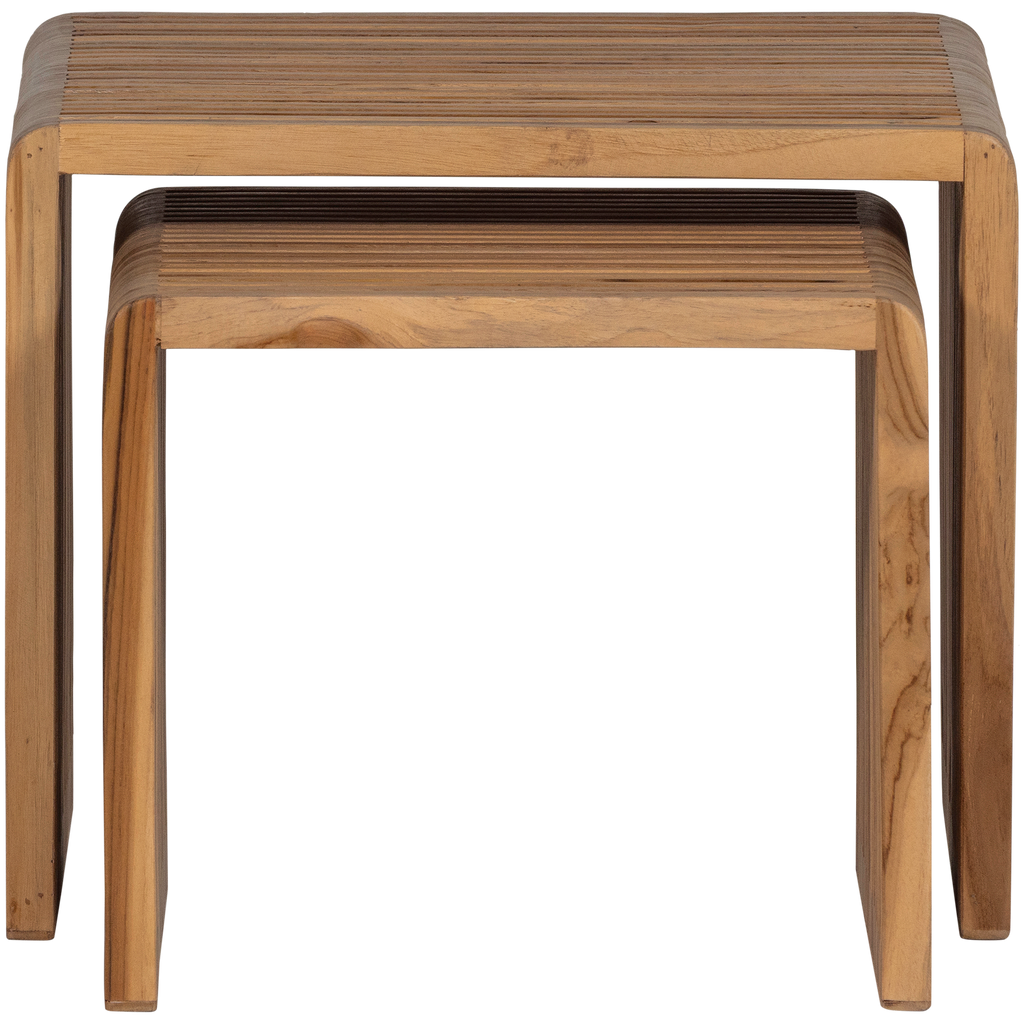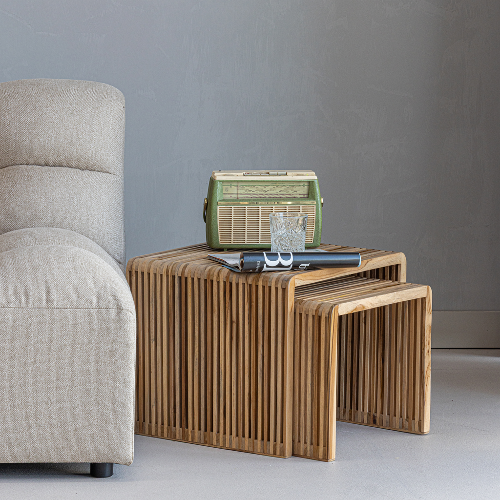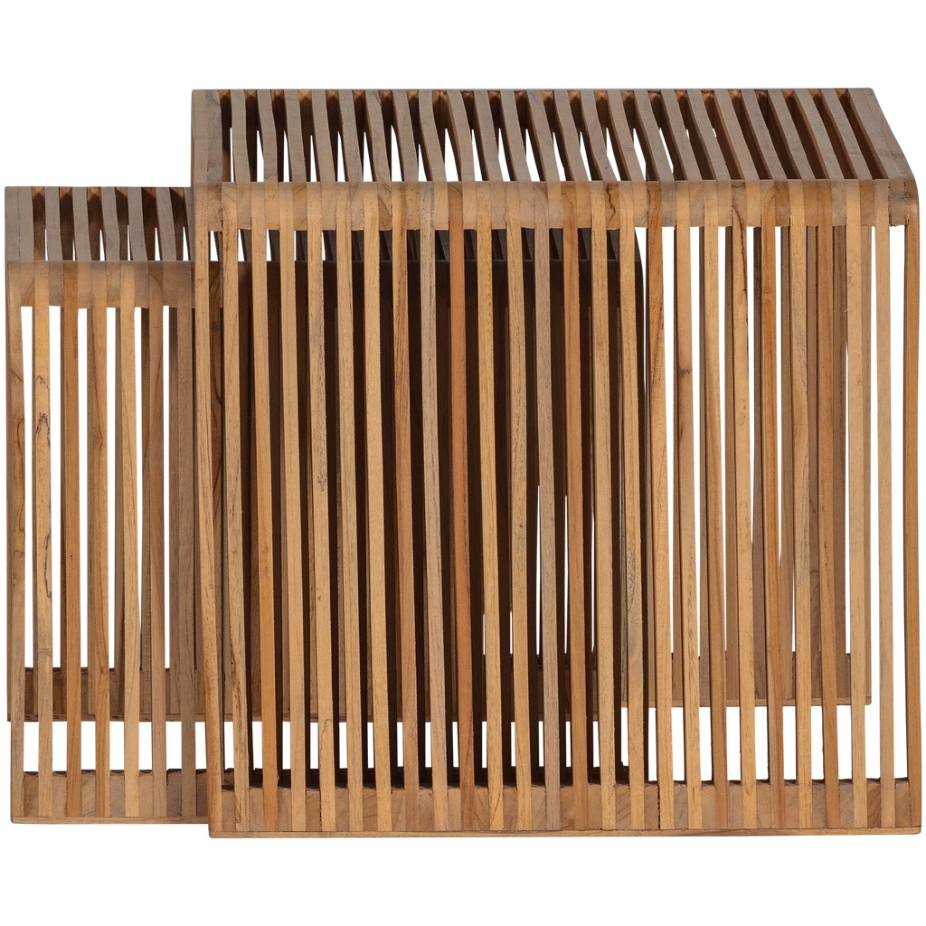 Set med två lekfulla sidobord i återvunnet teak. Naturlig och modern design som passar varje inredning.