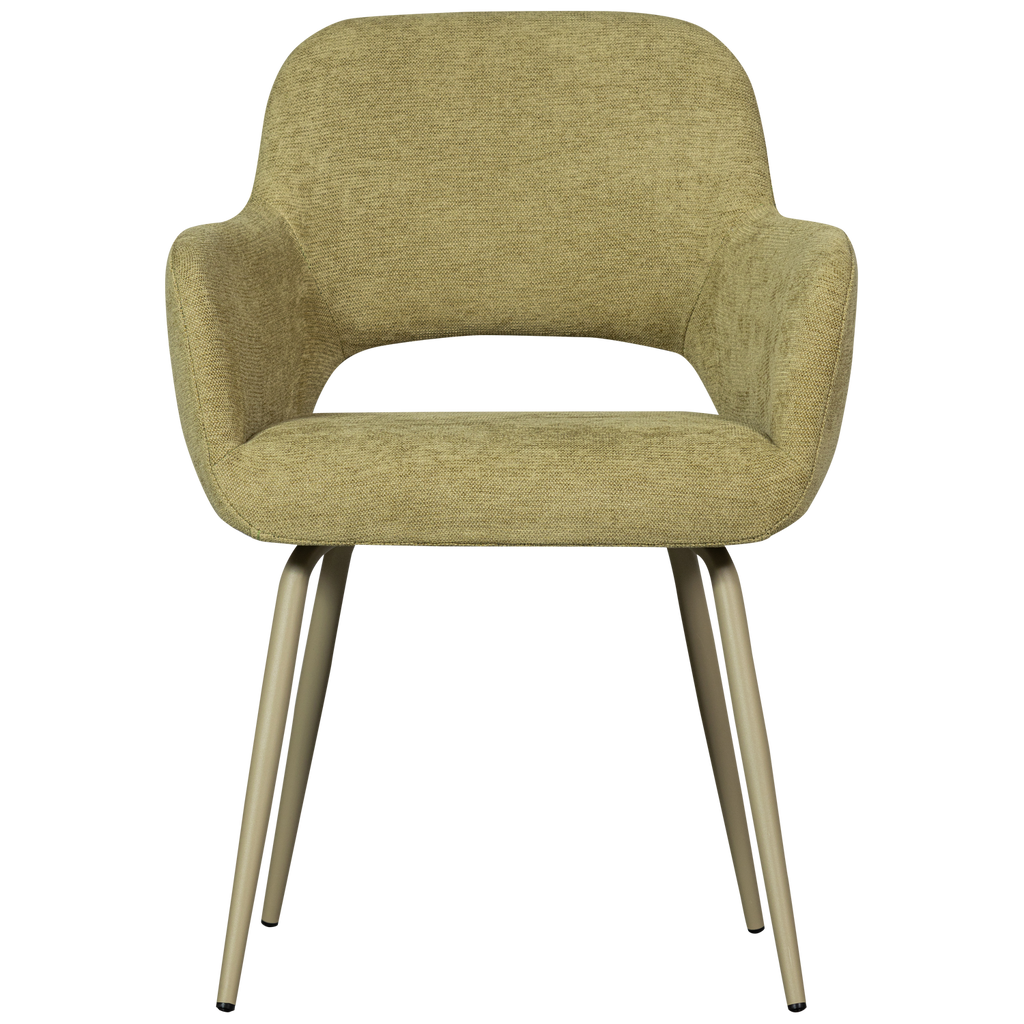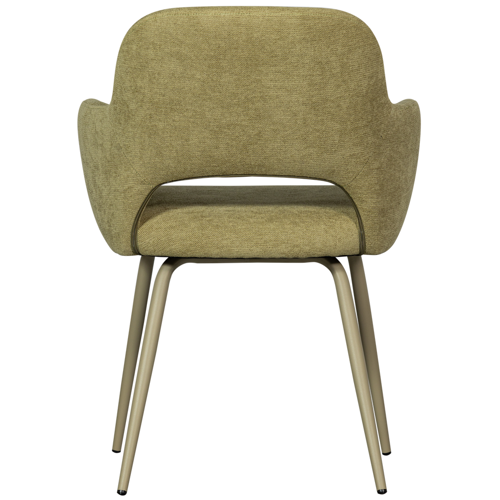 Stilren matstol med vävd salviagrön polyester, rundade hörn och komfortabel design. Perfekt för långa måltider.