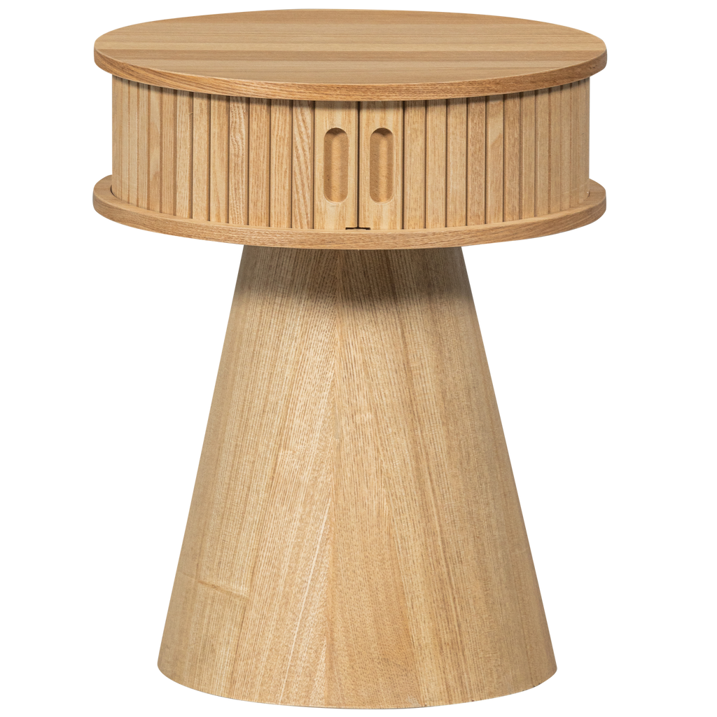 Den runda formen tillsammans med de innovativa skjutdörrarna erbjuder en smart förvaringslösning, perfekt för att hålla dina personliga saker nära till hands. Den släta ytan och den raka ådringen i träet bidrar till en stilren och elegant look.