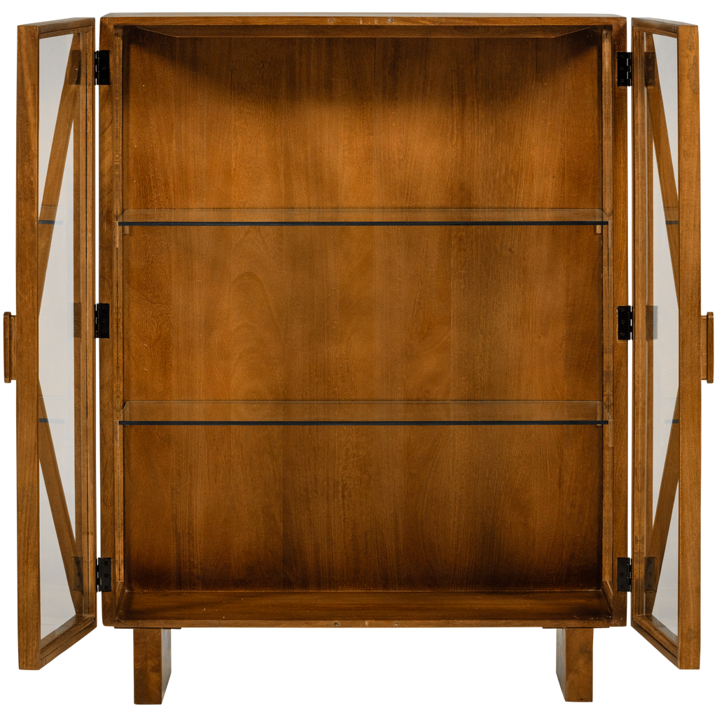 Skåpets glasdörrar och hyllplan gör det perfekt för att visa upp vackra föremål eller serviser. Den moderna och naturliga designen med en distinkt X-design ger extra karaktär, medan de subtila färgnyanserna i mangoträet gör varje skåp unikt.
