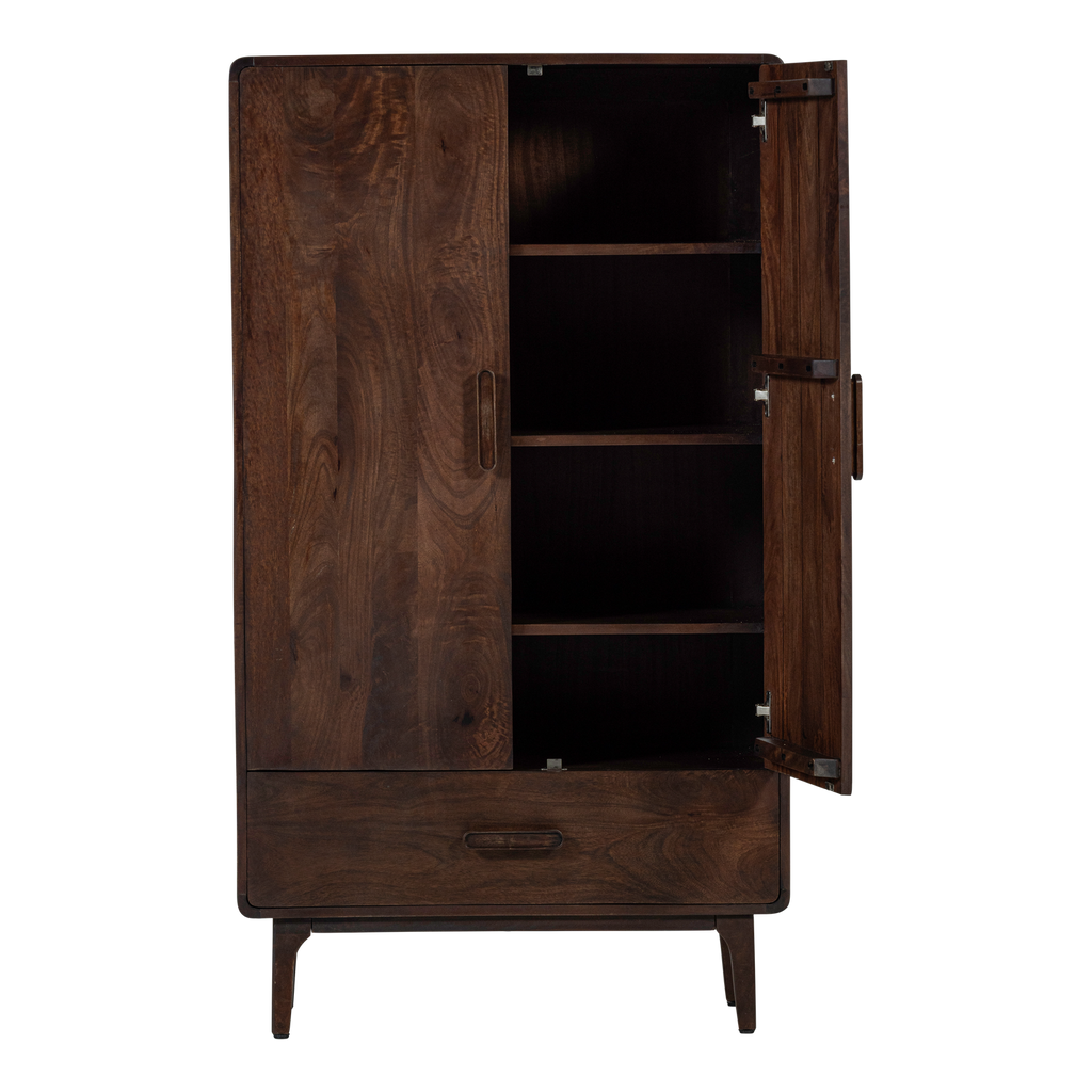 Förhöj ditt hem med WOOOD Liya 2-dörrars skåp i mörkbrunt mangoträ, som kombinerar elegans och funktionalitet.