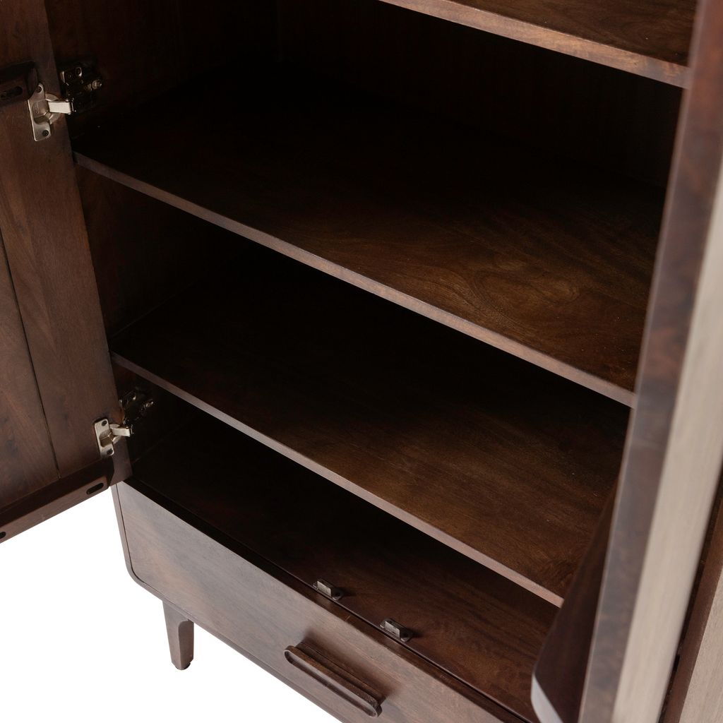 Skåpet har en lyxig design med mjukt rundade hörn, vilket ger en inbjudande känsla. Tillverkat av robust mangoträ, är varje skåp unikt tack vare den naturliga träådringen. De distinkta handtagen i matchande trä förstärker skåpets elegans.