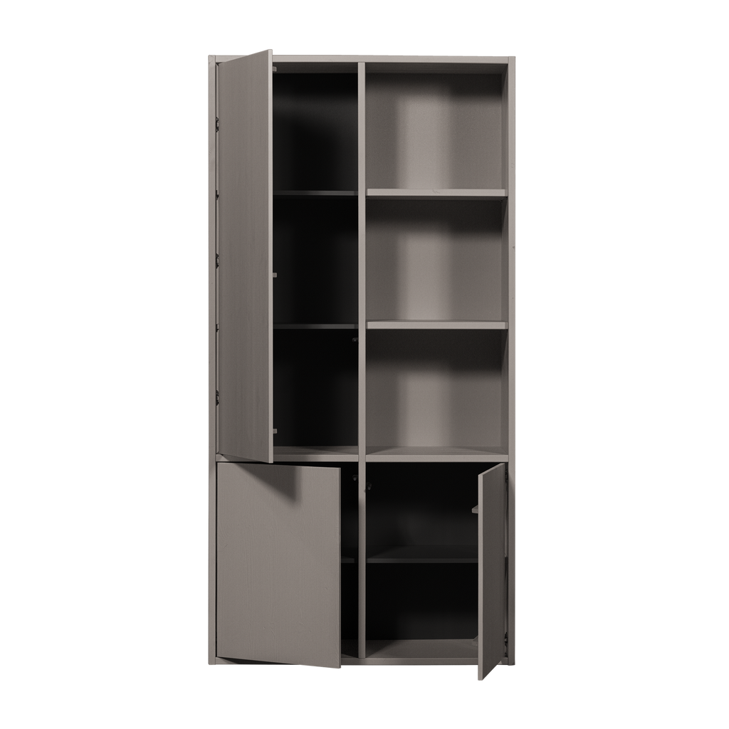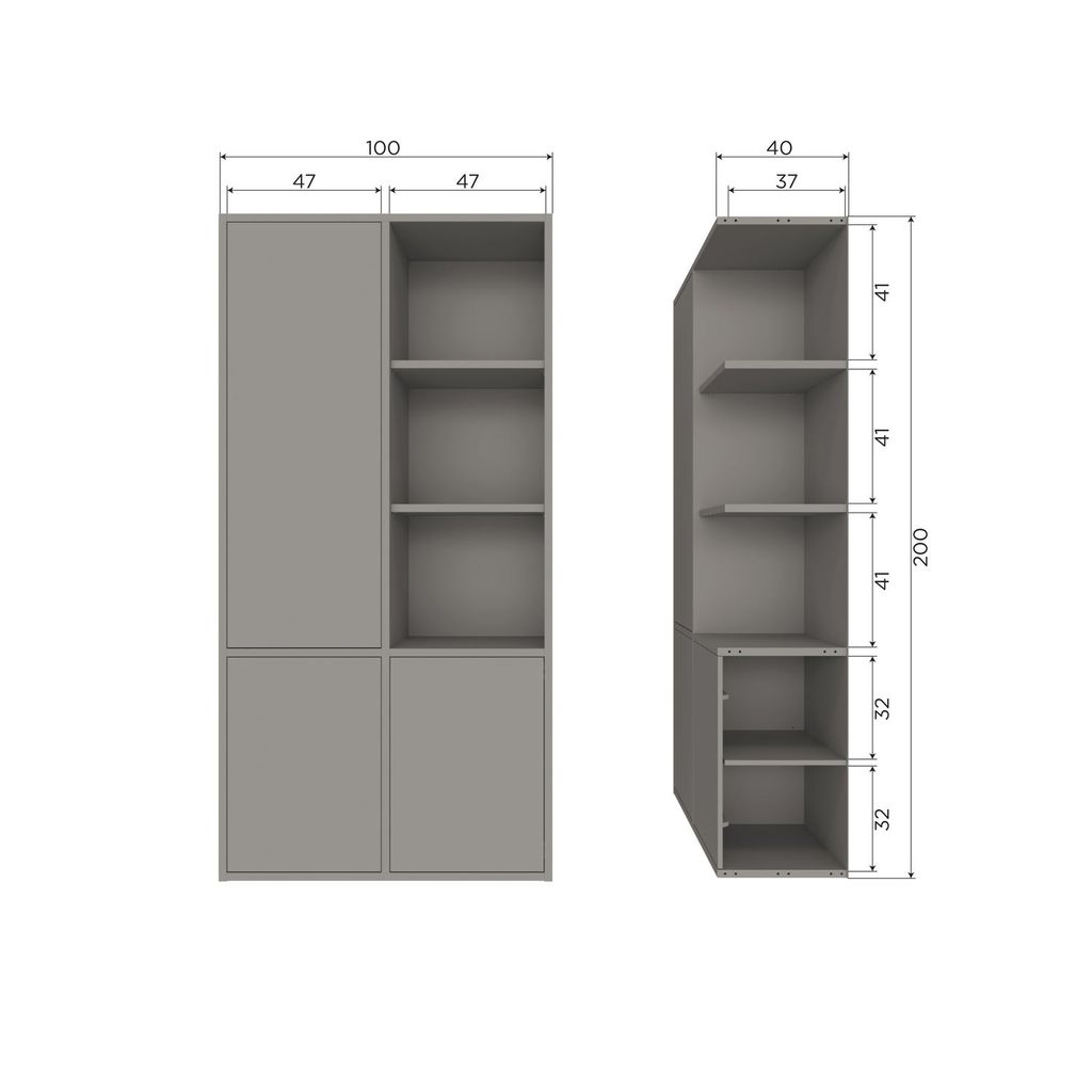 Designen består av både öppna och stängda sektioner som ger flexibilitet i din förvaring. De synliga hyllorna till höger kontrasterar vackert mot de dolda, mörka hyllorna bakom dörrarna. Dimensionerna är H 200 cm x B 100 cm x D 39,5 cm, vilket ger gott om utrymme för alla dina behov.