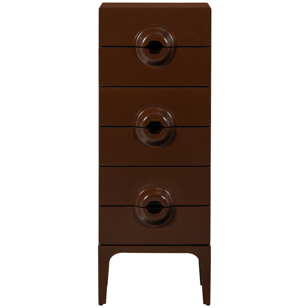 Med sina dimensioner på 120 cm i höjd, 44 cm i bredd och 45 cm i djup, erbjuder skåpet gott om utrymme för att hålla dina föremål organiserade och utom synhåll. Dess eleganta retrodesign framhävs av sex rymliga lådor, var och en med unika, runda handtag som gör det enkelt att öppna och stänga.