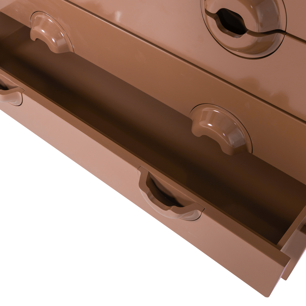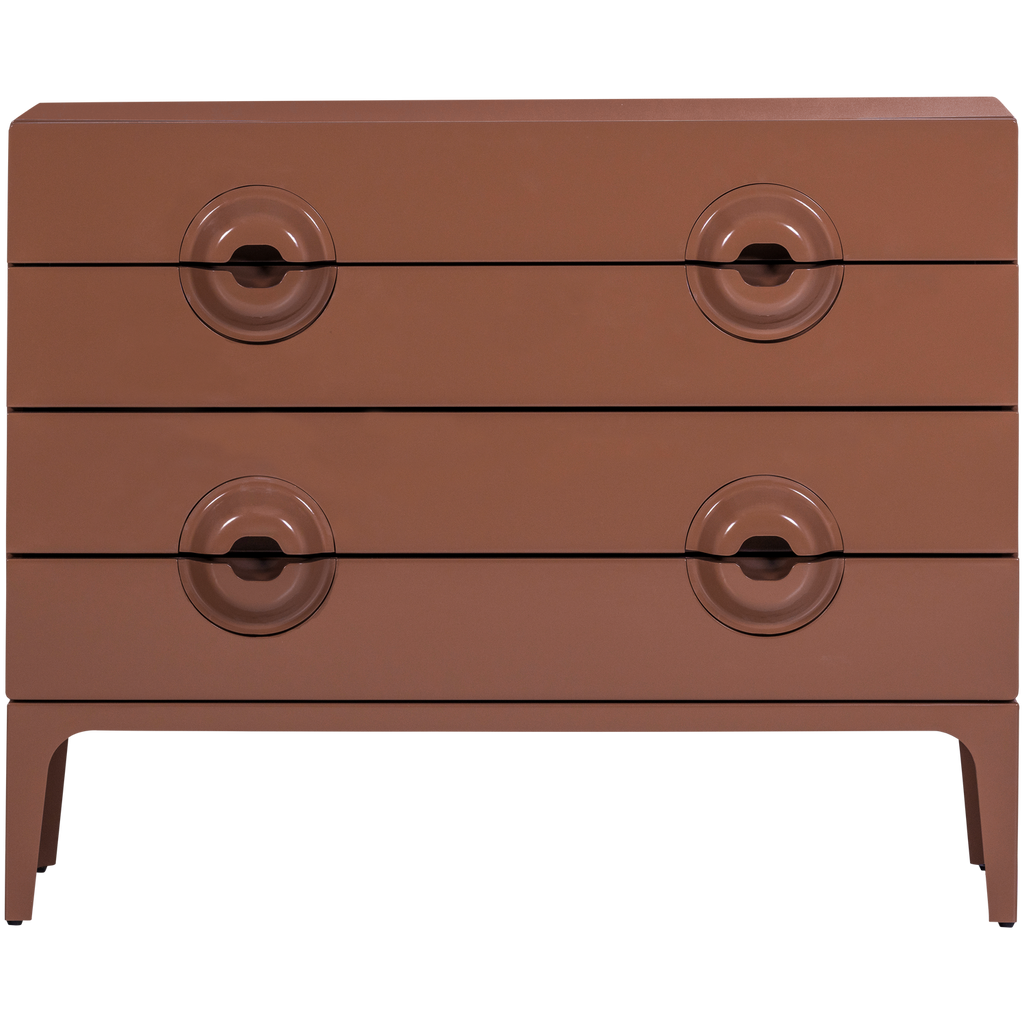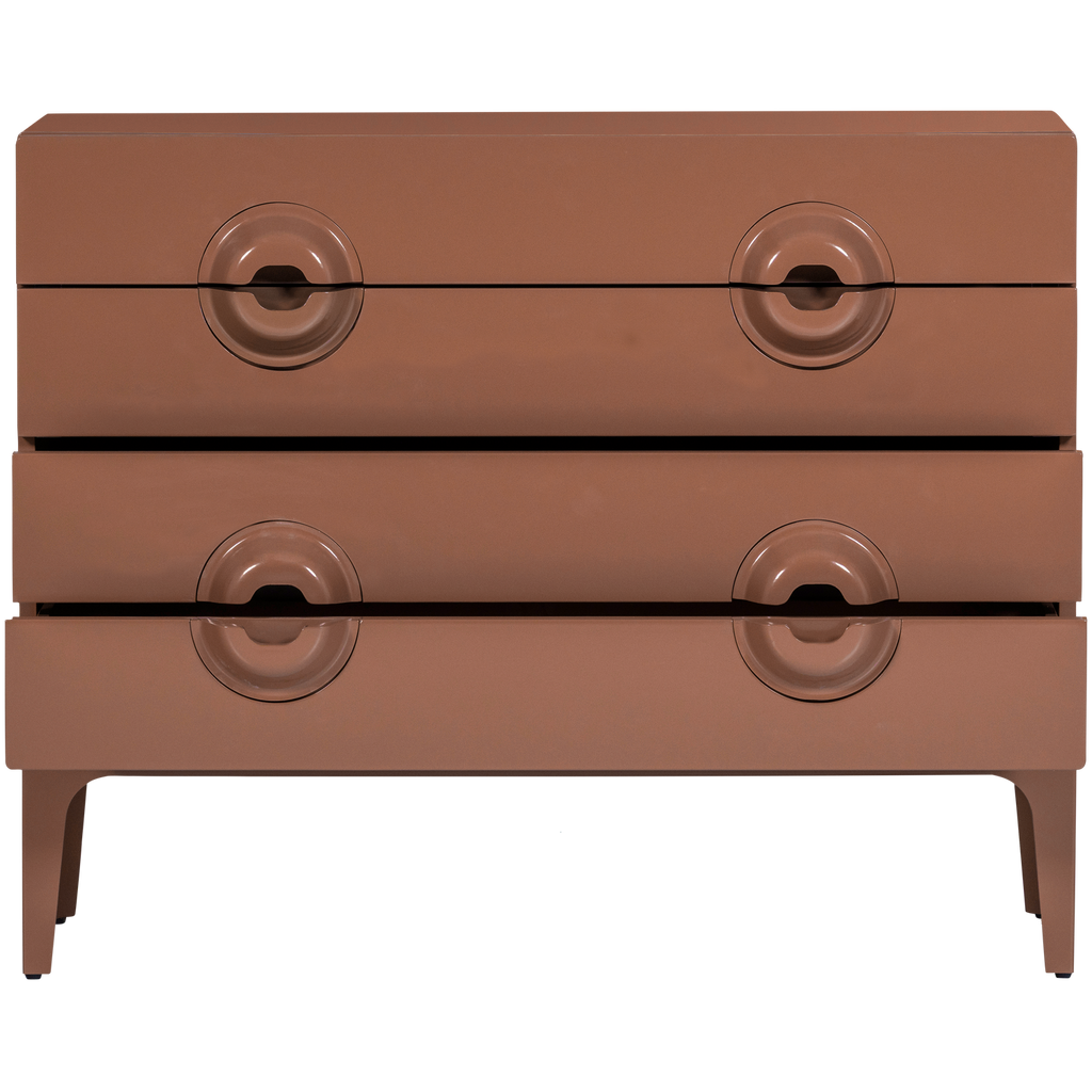 WOOOD MERGE byrå är ett mästerverk i eukalyptusträ, känt för sin hållbarhet och styrka. Den har en varm brunrosa ton som tillför en sofistikerad elegans till vilket rum som helst. Med sina fyra rymliga lådor, alla utrustade med unika runda handtag, erbjuder denna byrå både stil och funktionalitet.