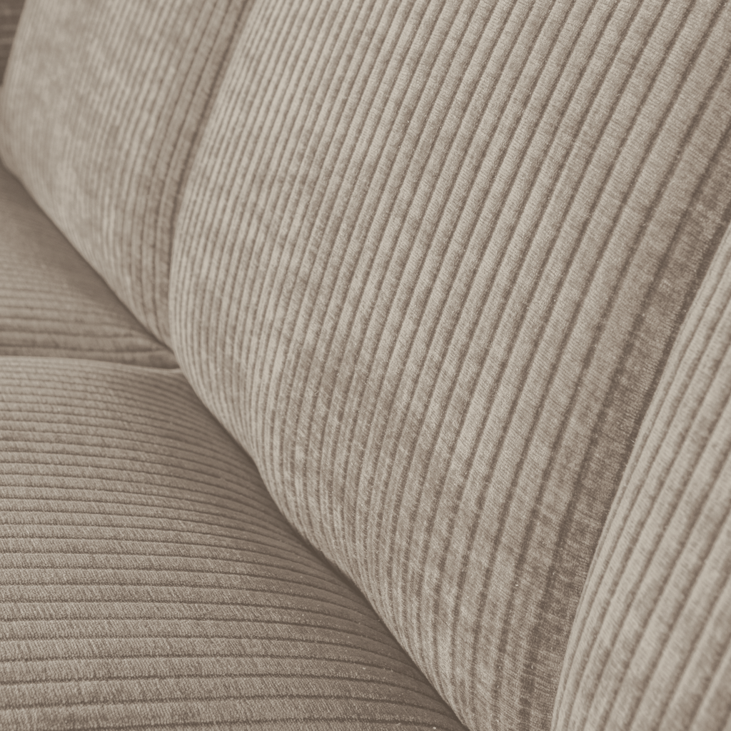 Elegant och bekväm matbänk i mörk sandfärgat ribbat tyg, idealisk för stilfulla matrumsinställningar.