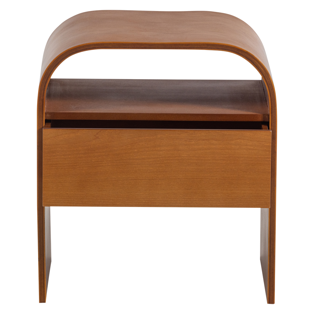 WOOOD Momo Sängbord/Sidobord erbjuder både stil och funktionalitet till ditt hem. Med sin runda form och varma bruna nyans, förstärker det en inbjudande och hemtrevlig atmosfär i både sovrum och vardagsrum.