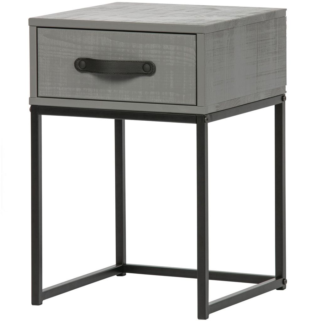 Stilrent sängbord i rustikt granträ med praktisk förvaring i lådan. Perfekt för det moderna sovrummet.