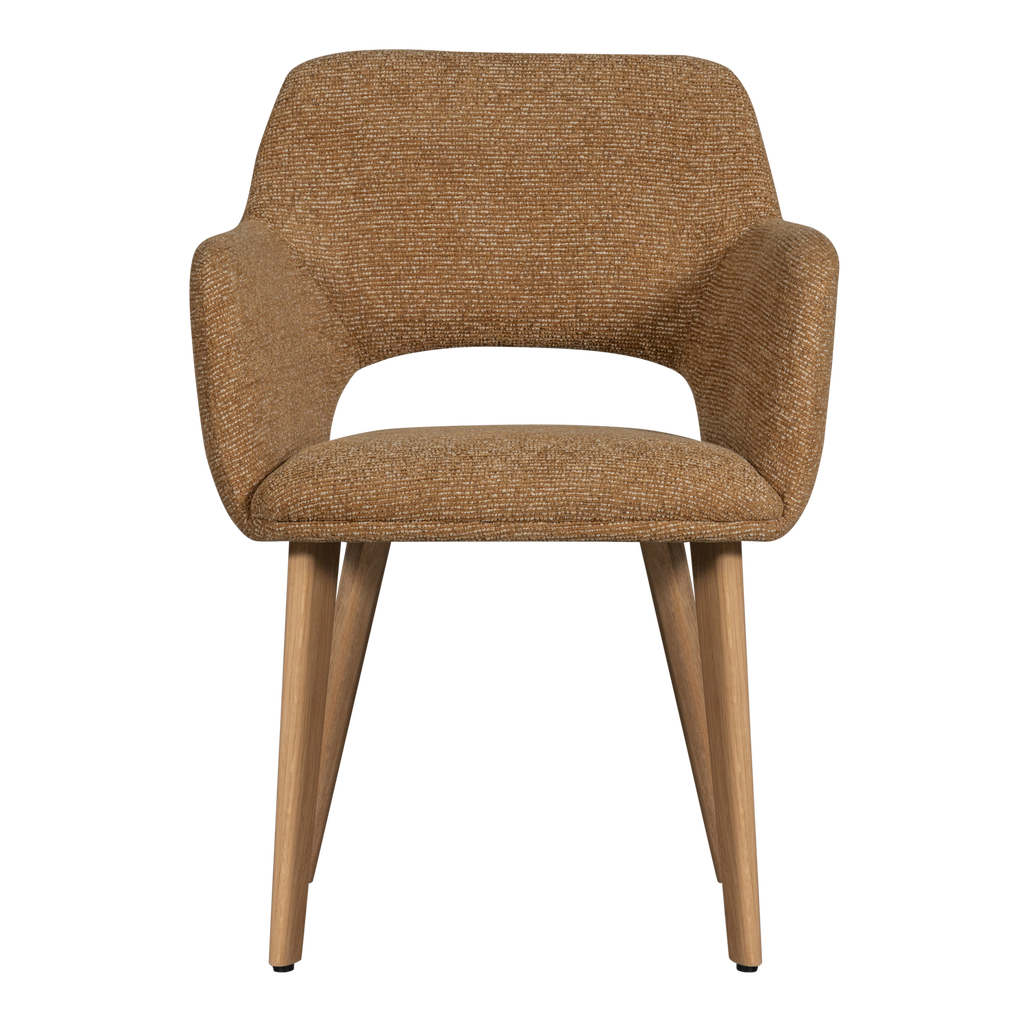 Elegant och bekväm matstol i gult Anil-tyg med ekben. Perfekt för moderna hem.
