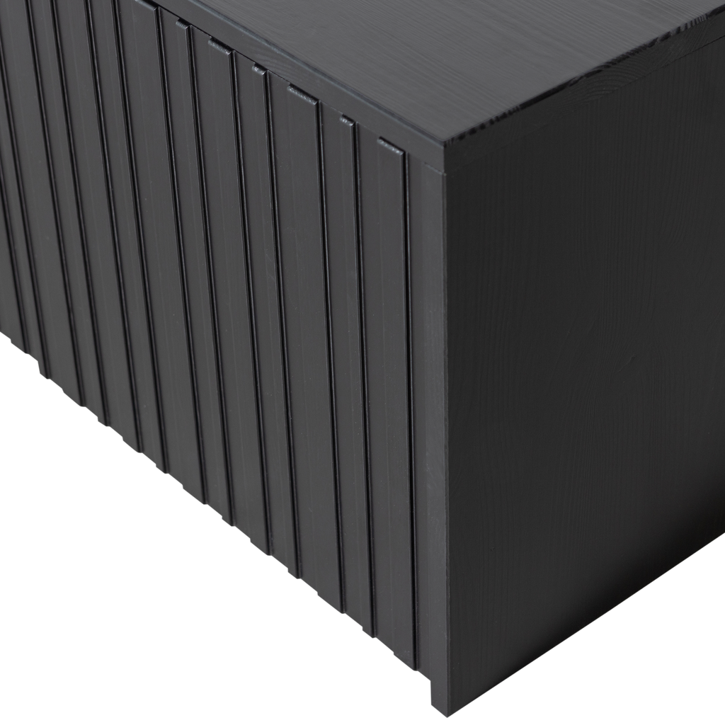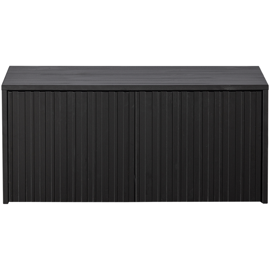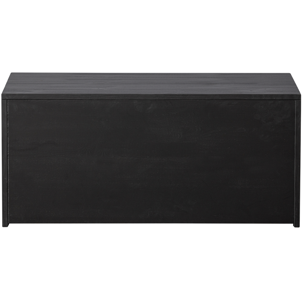 Elegant kistbänk i svart furu med grafiska reliefdörrar, perfekt för förvaring och sittplats. Hållbar och FSC-certifierad.