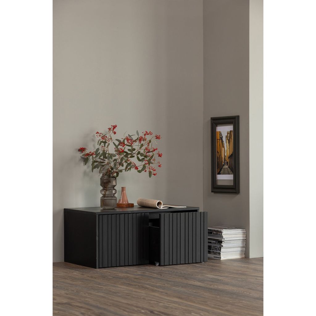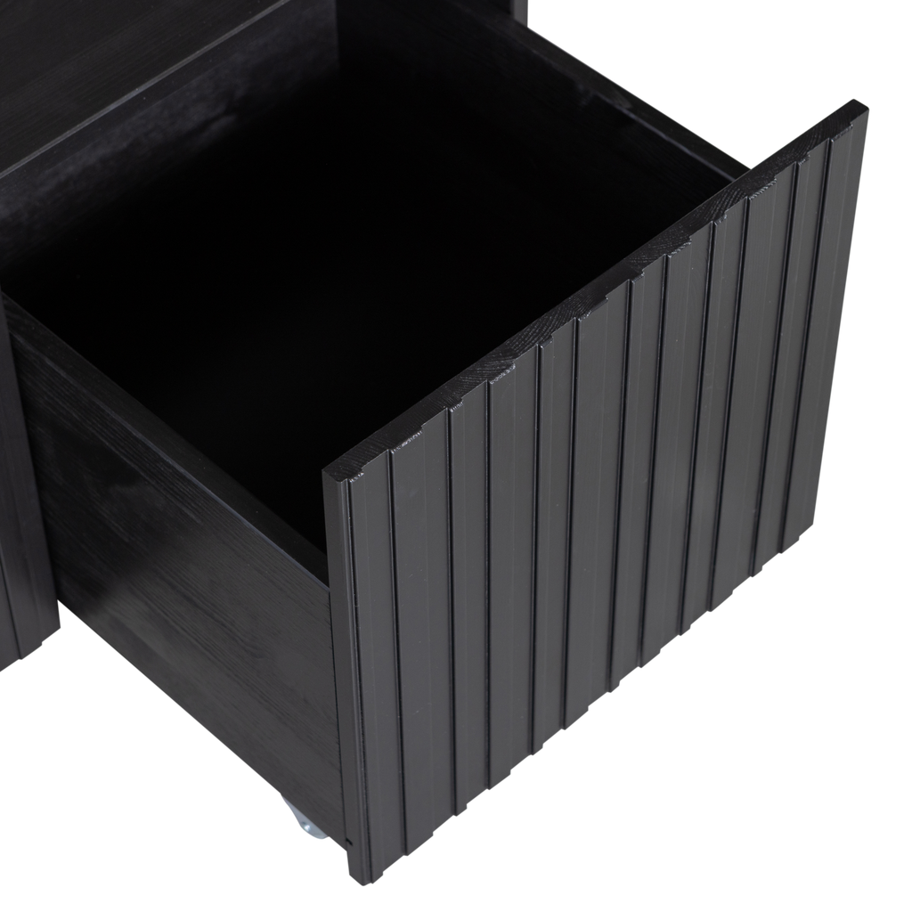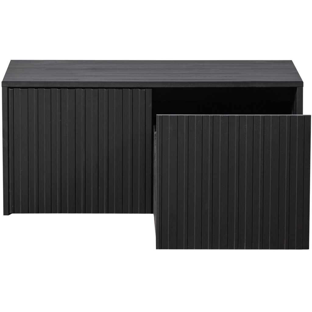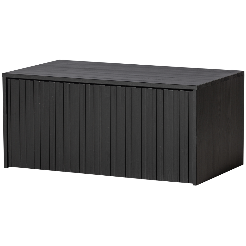 Elegant kistbänk i svart furu med grafiska reliefdörrar, perfekt för förvaring och sittplats. Hållbar och FSC-certifierad.