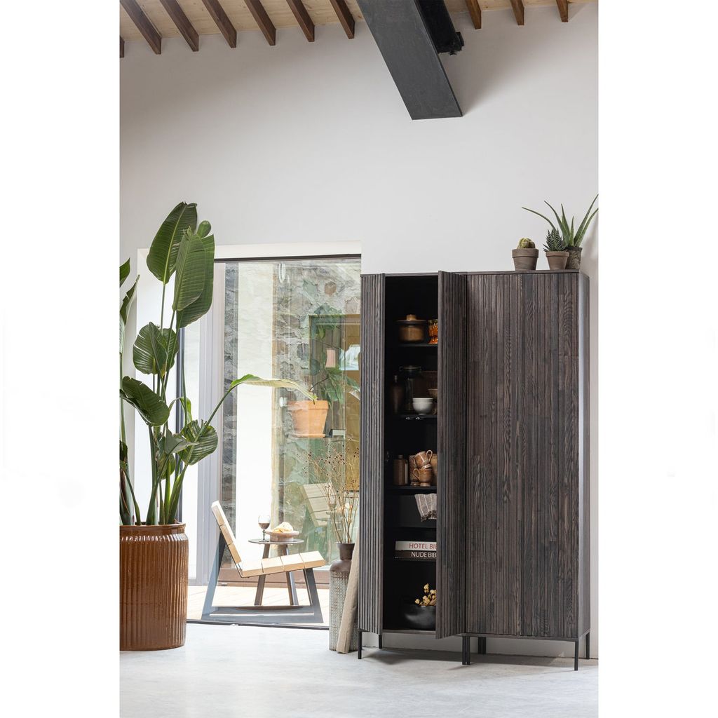 Ge ditt hem en modern och stilren förvaringslösning med WOOOD New Gravure Skåp. Detta eleganta skåp är tillverkat av höghållfast FSC-certifierat askfanér och spånskiva, vilket säkerställer en hållbar och miljövänlig möbel. Det djupa espressofärgade finishen och de grafiskt reliefmönstrade dörrarna ger en sofistikerad touch som kompletterar alla moderna interiörer.