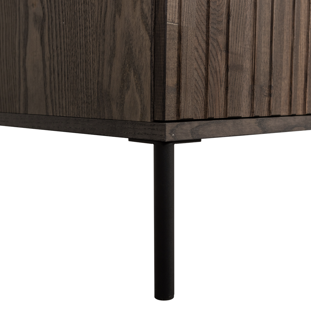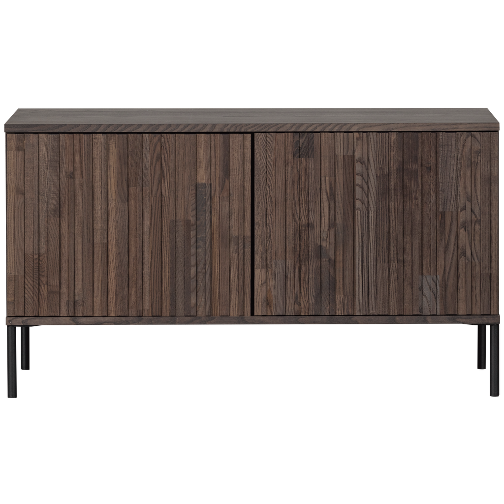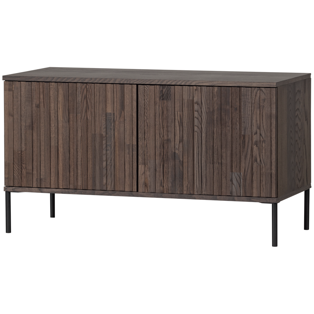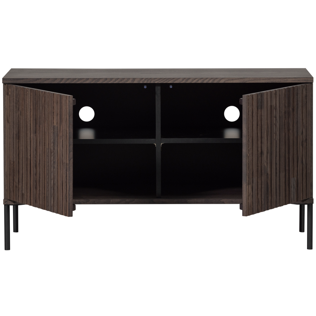 Stilren och funktionell TV-bänk i espressofärgat askfanér, med grafiskt präglade dörrar och praktisk förvaring.