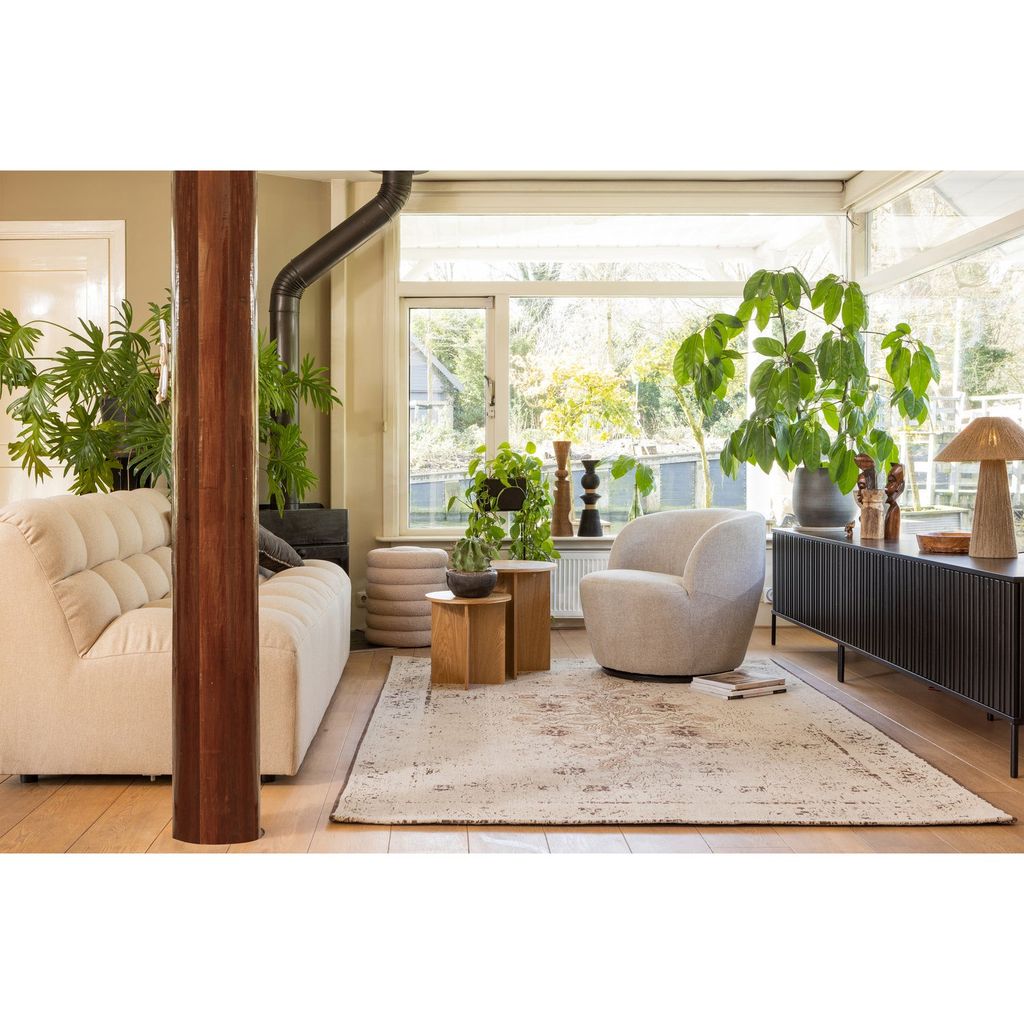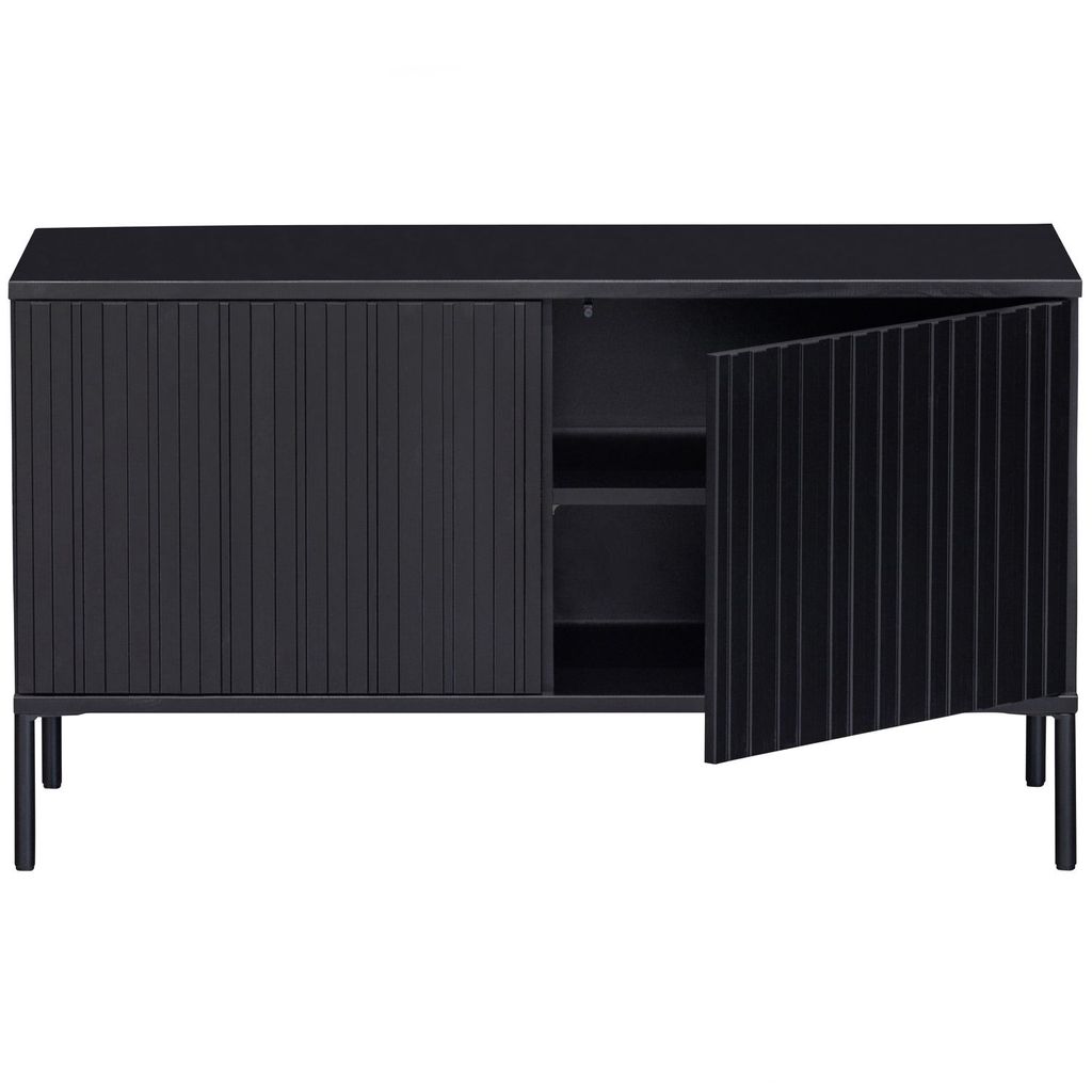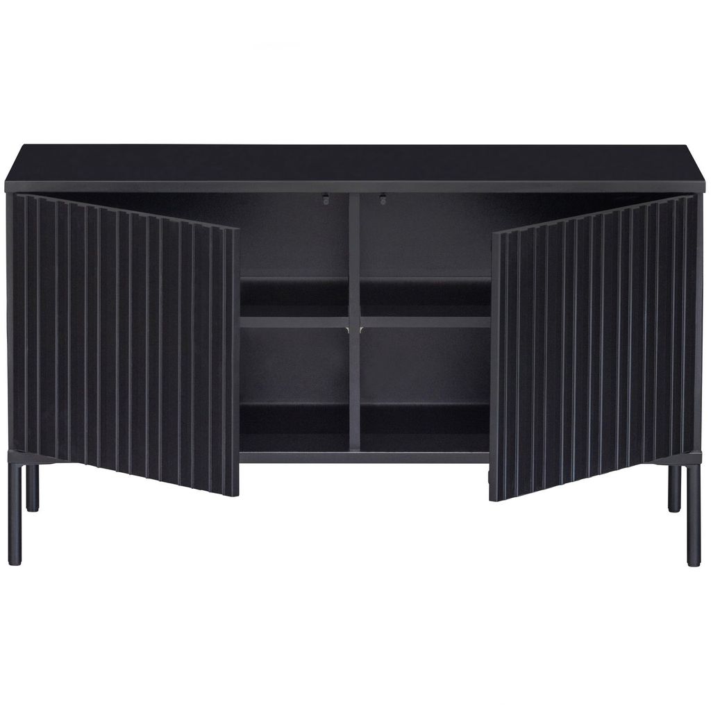 TV-bänken är utrustad med två grafiskt mönstrade dörrar som har ett tyst push-to-open-system, vilket ger enkel och smidig åtkomst till de fyra praktiska förvaringsfacken. Interiören i svart spånskiva kompletterar den eleganta exteriören.