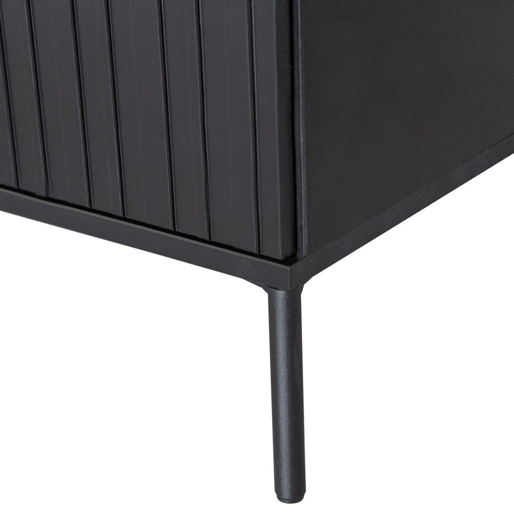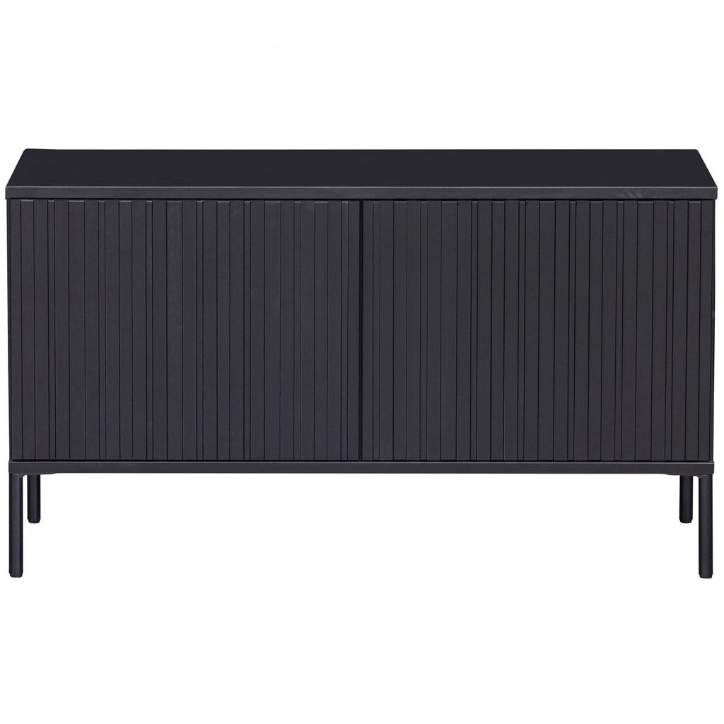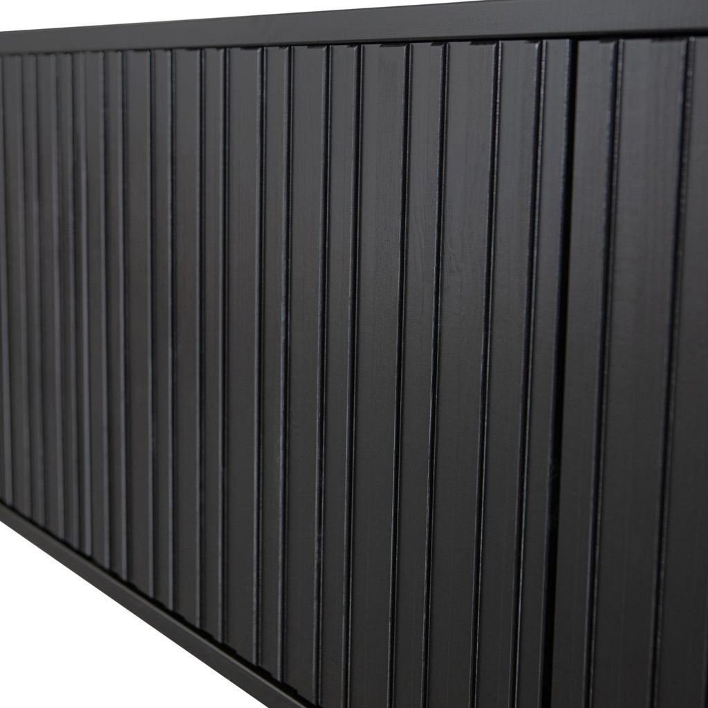 Elegant TV-bänk i svart furu med grafiskt mönstrade dörrar och metallben. Perfekt för moderna hem.