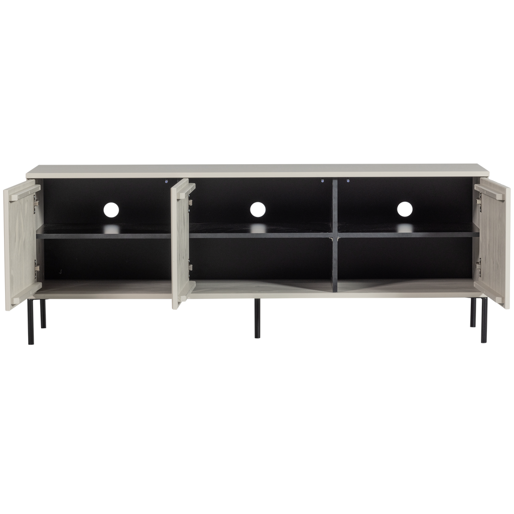 Med generösa mått på 150 cm i bredd, erbjuder denna TV-bänk gott om förvaringsutrymme. De två dörrarna öppnas med ett ljudlöst push-to-open-system och avslöjar en interiör i svart spånskiva med sex praktiska fack. Detta gör det enkelt att organisera elektronik och andra tillhörigheter.