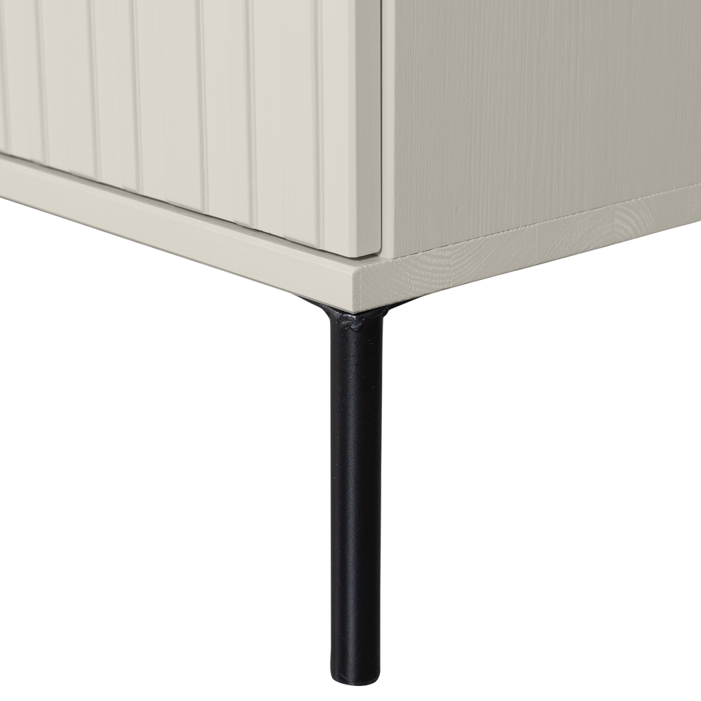 WOOOD NEW GRAVURE TV-bänk är en perfekt kombination av modern design och praktisk funktionalitet. Tillverkad av hållbart furu, erbjuder denna möbel en unik och naturlig skönhet som förstärks av en dammfärgad lack. De grafiska reliefdörrarna ger en stilren touch, medan de svarta metallbenen kompletterar bänkens eleganta utseende.