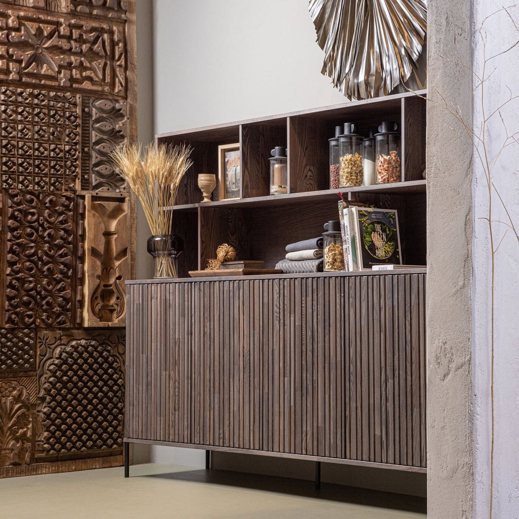 Den stilrena ytan i askfanér kombinerad med detaljer i brun espressobets gör detta skåp till ett tidlöst tillskott i alla rum. De fyra reliefdörrarna döljer en generös mängd förvaringsutrymme, med justerbara hyllplan för att optimera utrymmet efter dina behov. Den övre delen av skåpet erbjuder öppna hyllor, idealiska för att visa upp böcker, konstverk eller andra dekorativa föremål.