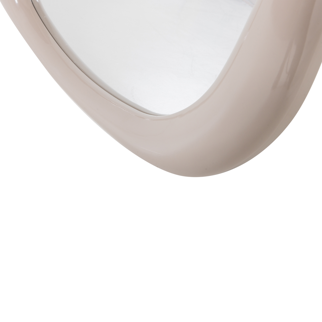 Den sandfärgade ramen ger spegeln en mjuk och naturlig estetik. Spegelglaset kännetecknas av en klar spegling och en slät yta, medan MDF-materialet är FSC-certifierat och behandlat för extra hållbarhet.