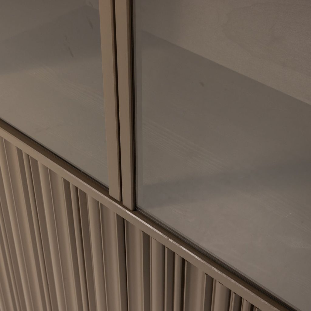 Elegant vitrinskåp i FSC-certifierad furu med grafiska reliefdörrar för både öppen och dold förvaring.