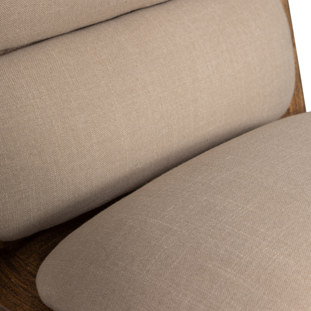 Sitt- och ryggkuddarna är klädda i en mjuk bouclé som ger både stil och komfort. Fåtöljens design passar perfekt i både vardagsrum och sovrum, tack vare dess naturliga ton och tidlösa form.
