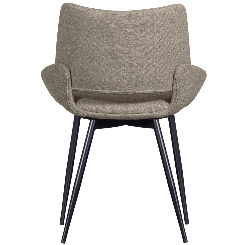 Elegant matstol med kuppelformad sits i sandfärgad melangetextil och koniska metallben. Perfekt för att skapa en stilren matsal.