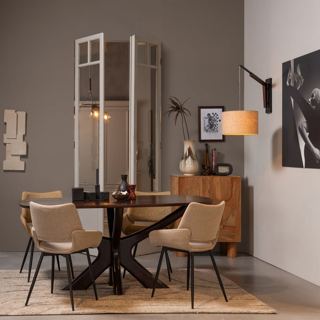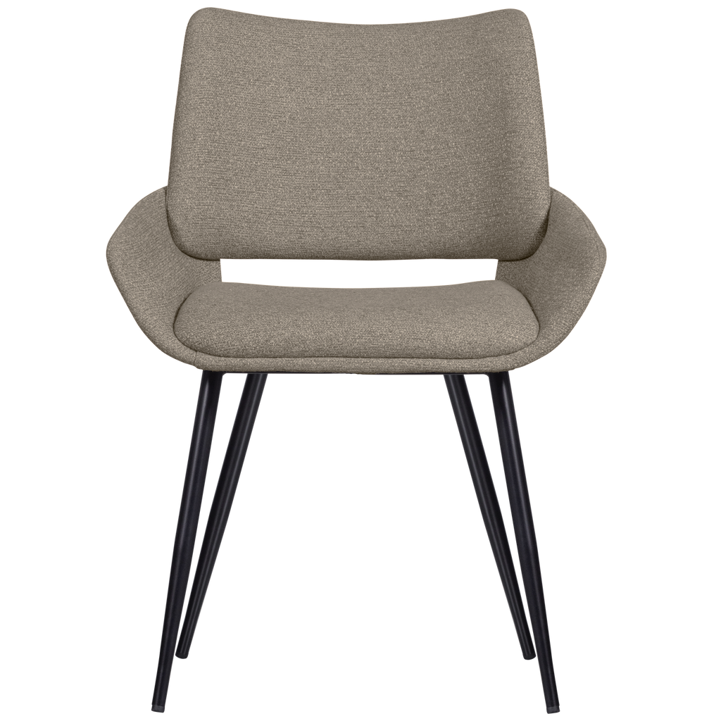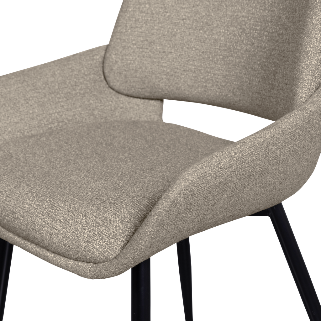WOOOD Parade matstol är en stilren och komfortabel stol som kombinerar modern design med funktion. Kuppelformad sits klädd i en vacker sandfärgad melangetextil ger en elegant och inbjudande känsla. De koniska metallbenen erbjuder inte bara stabilitet utan också en luftig visuell effekt.