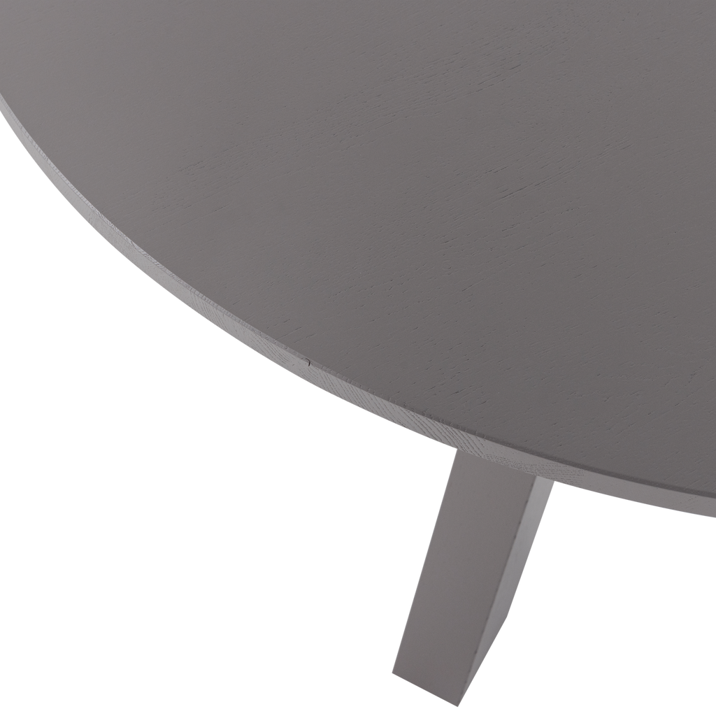 Bordet är tillverkat av hållbart ek med tydliga ådringar och en ljusbrun ton som kompletteras av en varmgrå lack. Den subtila gula glöden i träet syns genom lacken, vilket framhäver bordets naturliga skönhet. Den rundade formen bidrar till en intim och inbjudande atmosfär.
