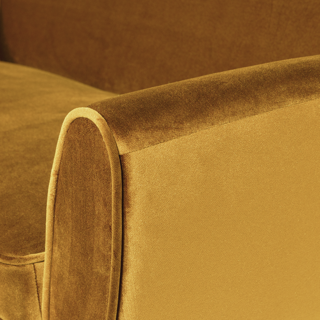 Elegant soffa i ockragul sammet som kombinerar modern design med hög komfort och hållbarhet.