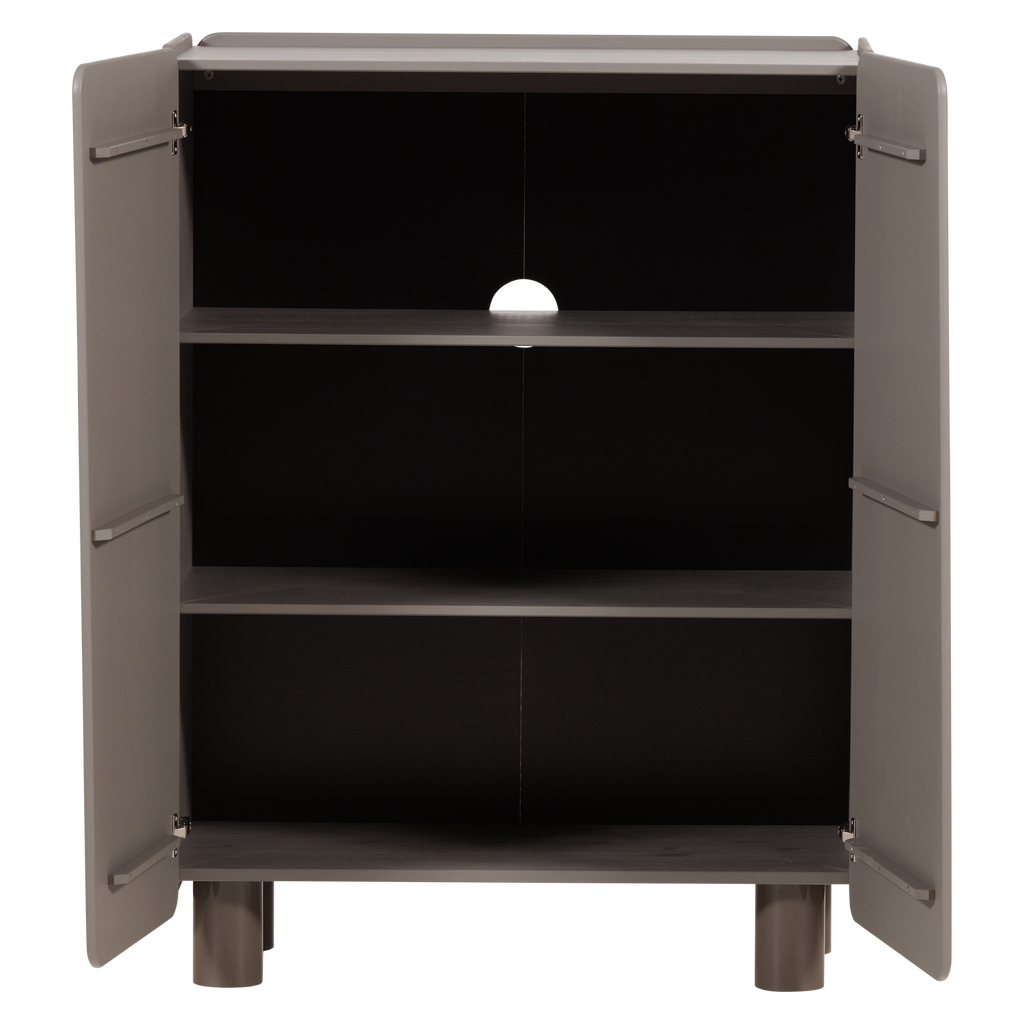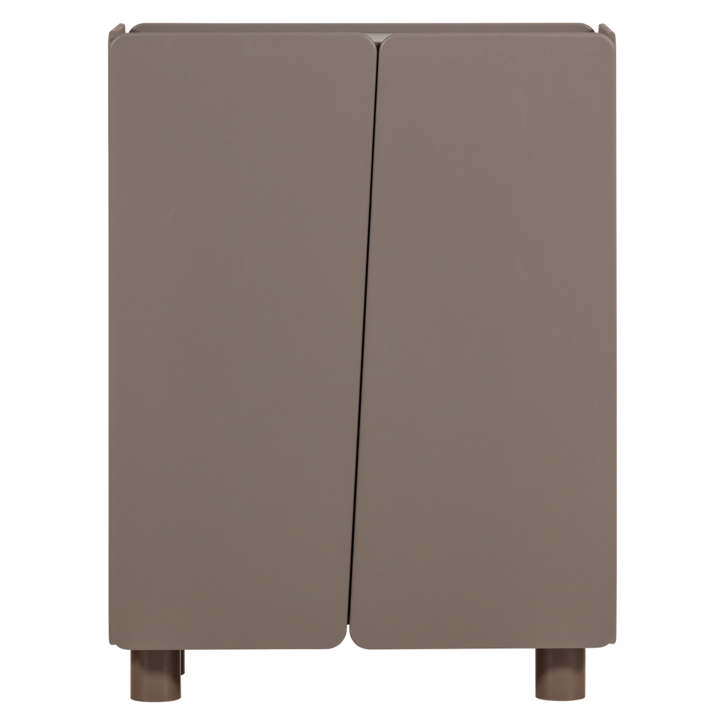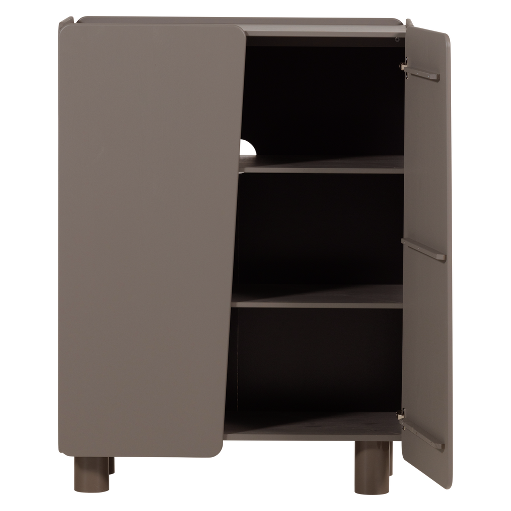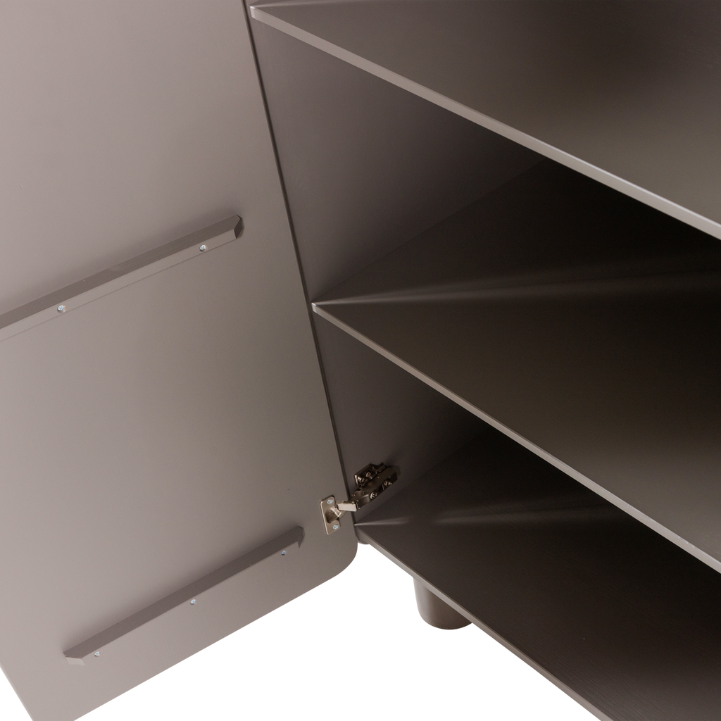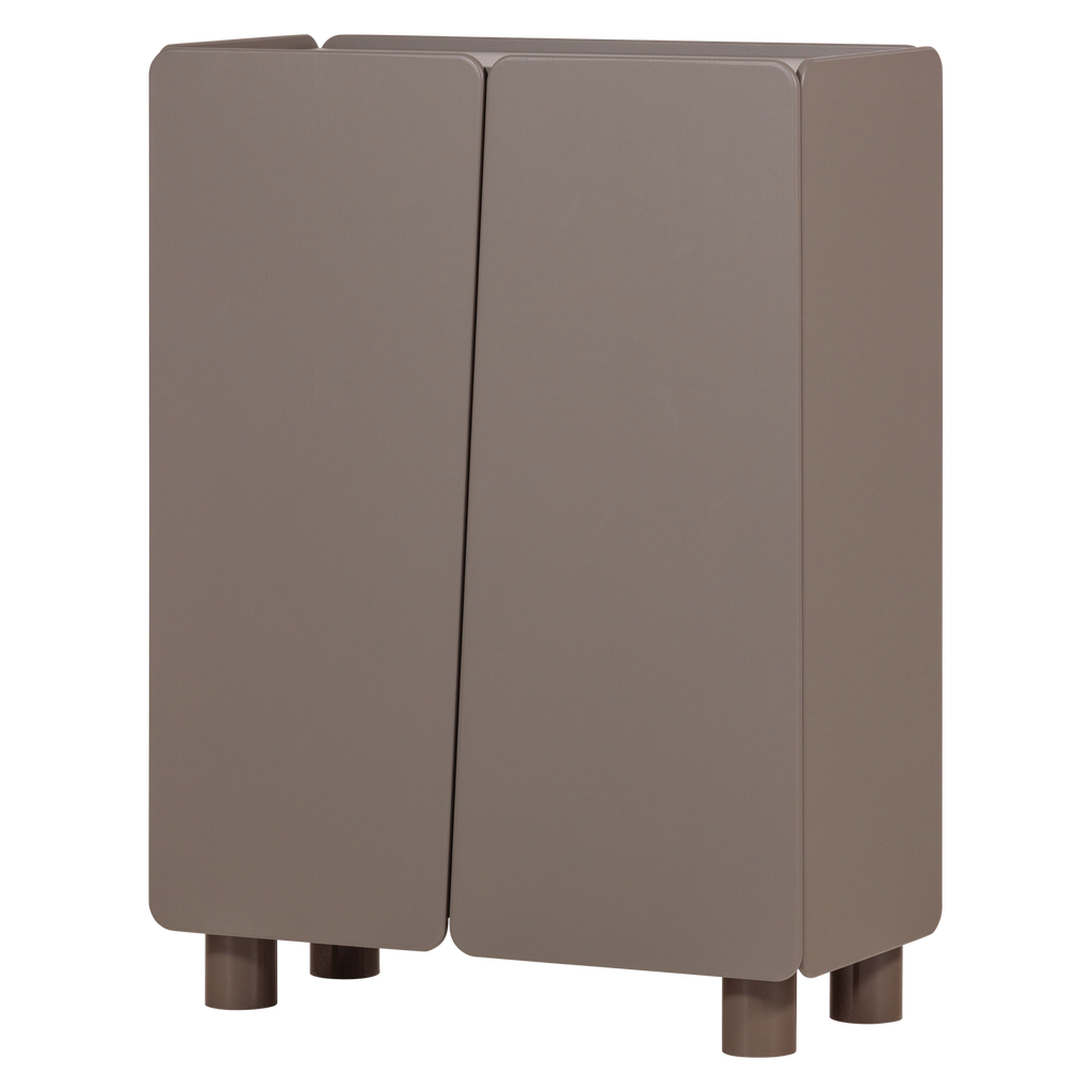 Elegant skåp i truffle brun färg med rundade hörn, justerbara hyllor och FSC-certifierat trä.